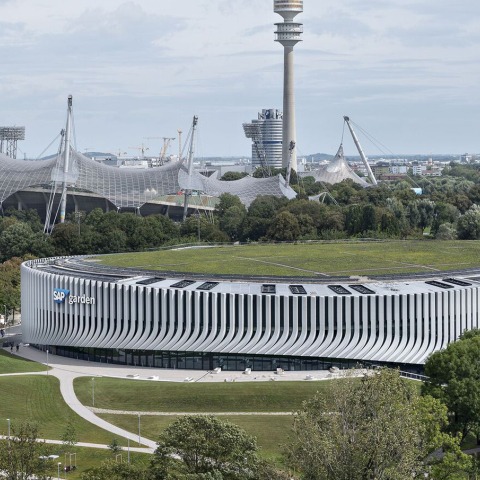 3XN Architects designed the SAP Garden as a free-standing, oval volume, respectfully inserted into the natural context of the world-famous Munich Olympic Park complex. Its appearance is characterised by its green roof and the vertically structured façade with vertical pilaster strips, modelled on ice hockey sticks. The envelope is formed by a total of 260 pilaster strips with a length of 11.6 to 18.2 metres.