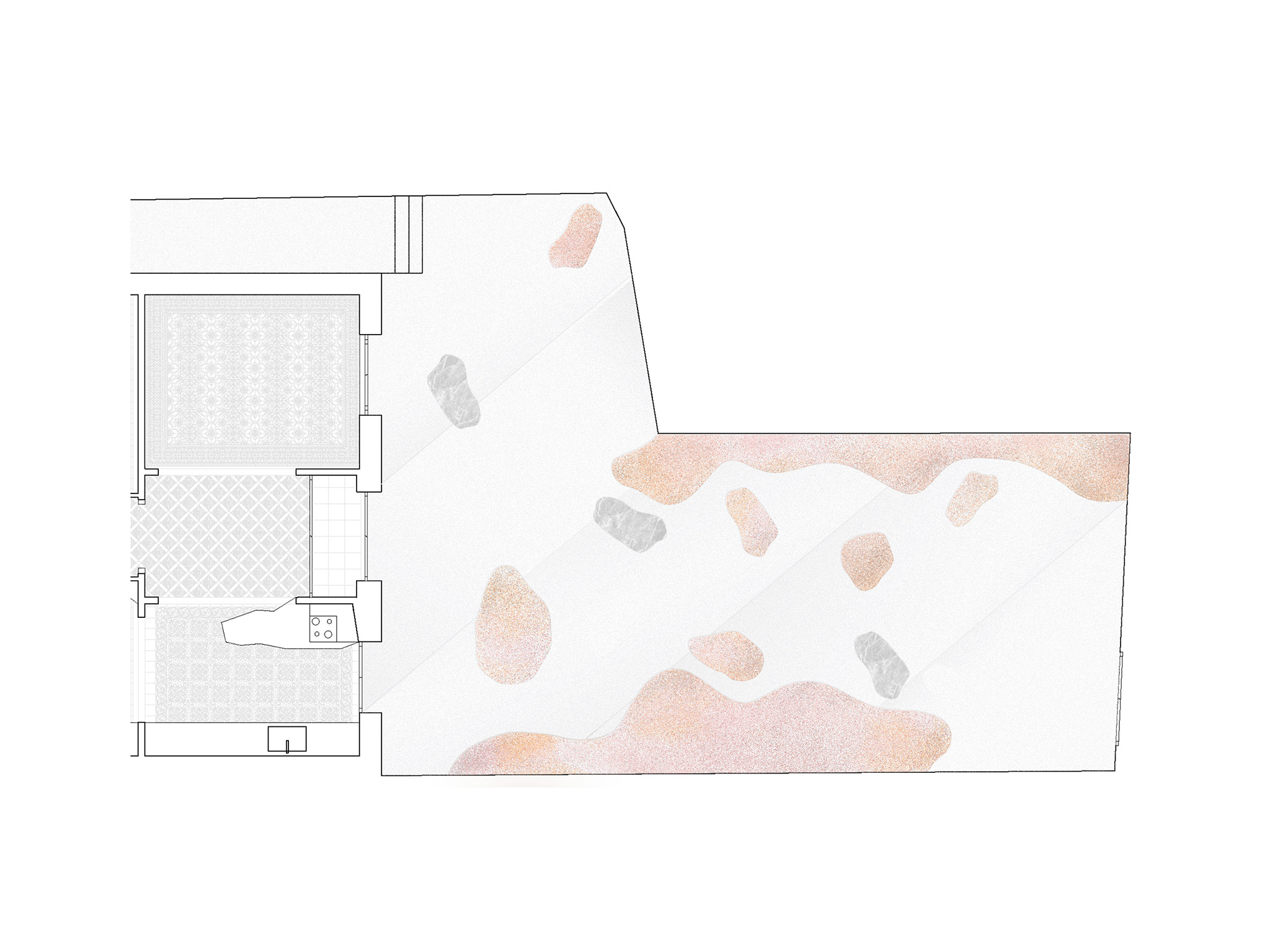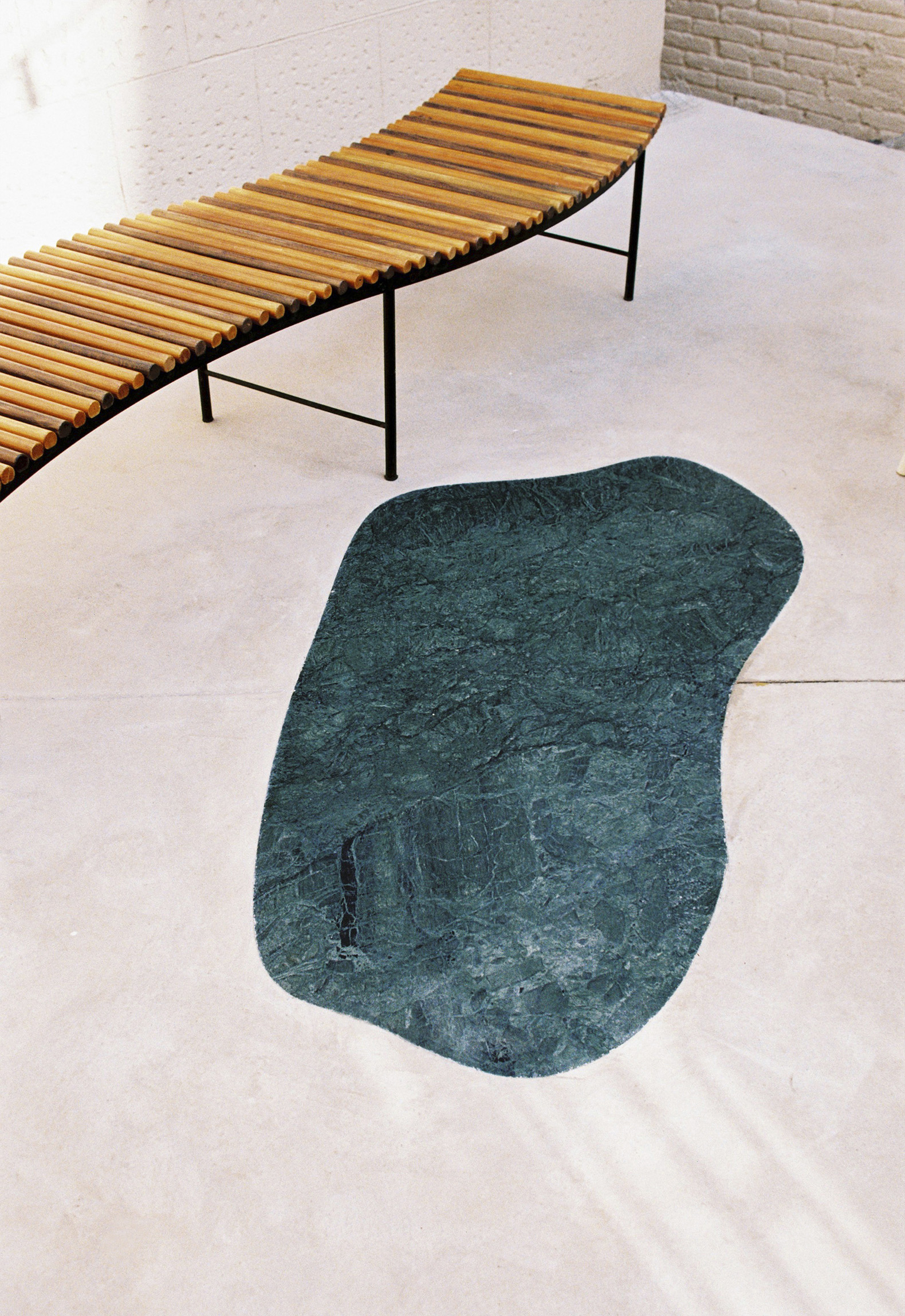 The project embraces this condition and constructs a space that can be read, experienced, and reinterpreted as a large children’s game. The new ground finish is conceived as a cloud: a continuous, light-colored, gently curved surface that seems to hover above the ground. Embedded within this cloud are pieces of green marble, reinterpreting the footprints of the giant who lives among the clouds, introducing a narrative reading and an imaginary scale into the space.