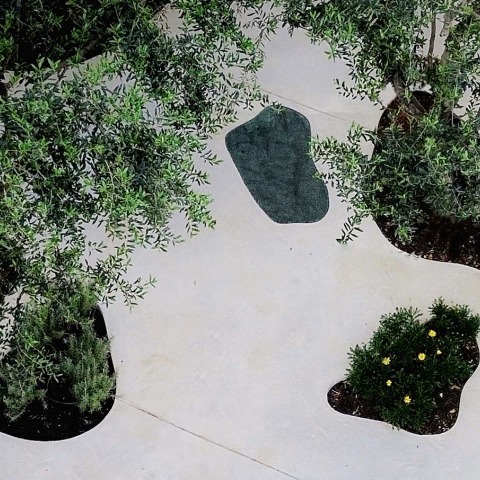 Openings in the paving define islands of low vegetation composed of aromatic and Mediterranean species, selected not for spectacular flowering, but for their ability to maintain structure, texture, and presence across all seasons.