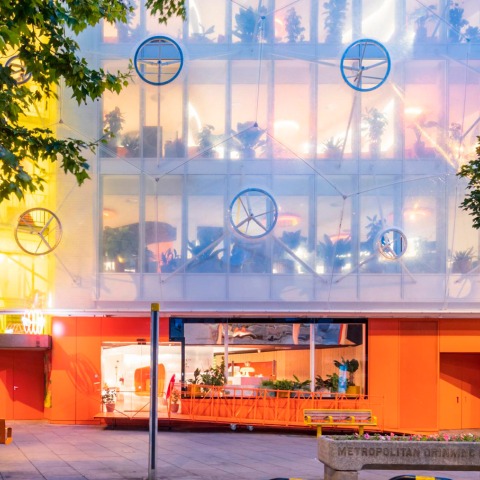 Second Home London Fields is clad in a ‘bubble’ façade made from ETFE, a highly efficient woven fabric stretching across a free-form frame, amplifying the surrounding urban landscape. Originally designed by victorian church architect James Cubitt, the front of the building served as an education space from the 1970s while the rear, known as Morley Hall, was a former cinema, dance hall, and temperance house dating back to 1879.