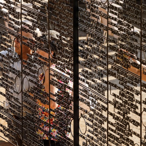 The gaps between the words can be used to place the flowers that the people brought in honour of the deceased. The circles that stiffen the trimmed iron plate can be used to house the bouquets of flowers. The lattice turns into a wall full of vegetation and colour on some dates, dynamic and loaded with symbology which provides contiguity between the collective memory, the past and the landscape.