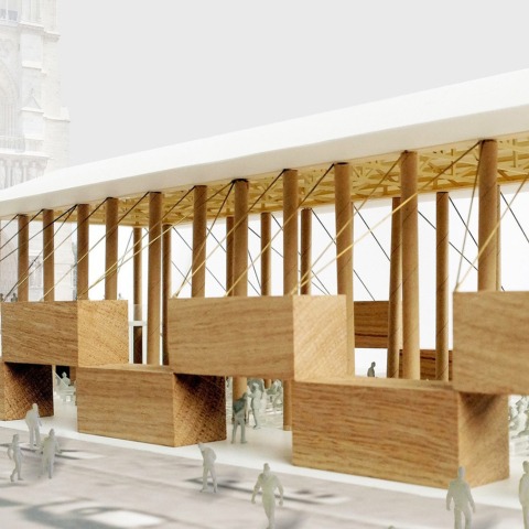 To create the structure, shipping containers are stacked in a checker pattern to allow an easy flow of movement at ground level, and to reduce the total number of containers. Lower containers are used as shops, chapels, and offices, while upper levels are used for storages and weight to tie down the roof. A viewing platform is imagined at the east end, allowing visitors to oversee repair work to the cathedral.