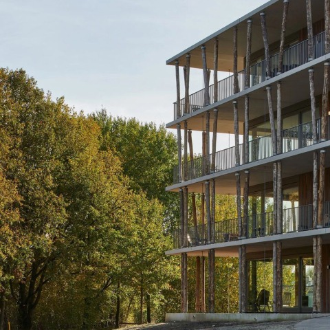 From the outside, you see no real distinction between the different sides of the building thanks to the continuous balconies supported by a colonnade of tree trunk columns. As the image of the tree trunk columns gets intertwined with the image of the trees in the park, the building blends in with its surroundings. Whereas traditionally architectural columns are modelled after trees, in this project we took a more literal approach; the trees are the columns. By using real tree trunks as columns, nature can be experienced up close to the outdoor space, the building feels alive. The façade cladding of aged and reclaimed wood, formerly used as river bank protection, adds to this experience.