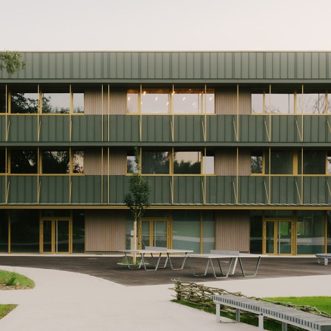 The façades are clad in green standing seam aluminium cassettes, evoking the metal gables of the Jura and the woodland character of the region. The south-facing facade has large sunshading caps suspended from a slender metal structure. These overhangs protect the façades and shelter the longitudinal external walkway. The composition of horizontal bands alternates aluminium and timber cladding, interspersed with large windows. This new envelope combines the existing and the new.