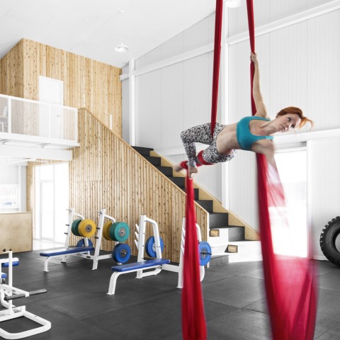 In order to create a sports centre that invites people to excel, Microclimat imagined a large open space on two levels that allows all the services and facilities for body-builders, gymnasts and fitness enthusiasts to be united under one roof. The combination of red cedar, cherry wood and steel helps create a warm and inviting space that lends itself to the members' sense of belonging.