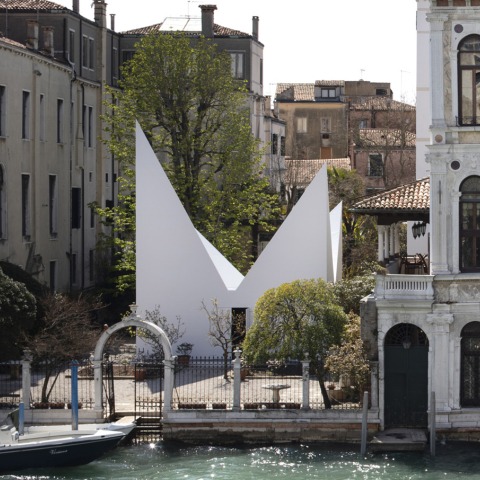 The shape is reminiscent of the ancient oriental practices of origami and tangram, as well as traditional Japanese and Korean houses based on a simple geometric modularity. In this case, the combination of volumes is articulated starting with four pyramids surmounting a parallelepiped, leaving a flat rhomboidal surface in the centre. Although perfectly symmetrical, Hanji House has a deliberate irregularity: one of the pyramids stands out, two metres higher than the others, breaking the balance of the forms. This “tower” recalls the idea of a lighthouse and at the same time echoes Venetian architecture: the entire pavilion evokes local forms, from the Gothic cathedral to the peculiar Renaissance style of the palaces, which wind their way from the Grand Canal to the inner part of the island. The image of the lighthouse, combined with that of the paper, also underlines both the object’s origin as a symbolic point of reference and its mutable, mobile aspect.