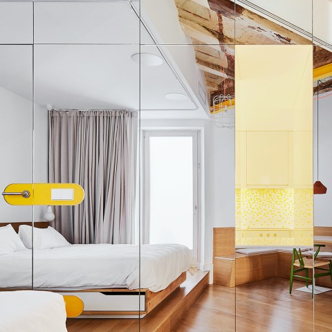 MIEL Architects together with STUDIO P10 have carried out the renovation of a house located in the neighborhood of Sant Antoni. Always with the idea of surprise as a tool to rediscover the everyday, the house is composed of a cube mirror located in the geometric joint of the apartment that allows prolonging the rooms, natural light and views.