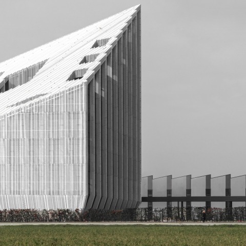 The headquarters is the last missing piece in a larger development called EVO, the Group’s largest industrial site in Italy. EVO is designed to satisfy the most recent energy efficiency standards, offering outstanding performance in terms of environmental impact, powered by a 3 MW peak power photovoltaic plant, mounted not only on the existing new plant roofs but also on the awnings of the staff car park. The new HQ is conceived as NZEB (nearly Zero Energy Building) and features geothermal heat pumps and radiant ceilings to further save energy and obtain additional internal comfort. It stands out as a recognizable landmark that both rises above and integrates itself with the surroundings—a radical approach towards sustainability with intelligent geometry