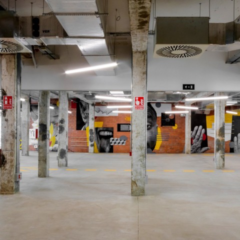 The collaboration of a local graphic artist in the interior, with some large-scale collages and graffiti, complements the architecture by dotting certain areas, feeding the idea of the building as creative support.