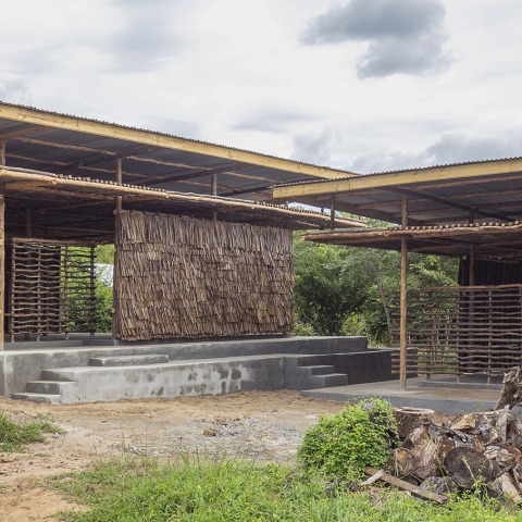Further, the interior space is defined by two screens of sisal and three walls of makuti - a local thatch material made from dried palm leaves. These screens provide privacy to the classrooms yet at the same time preserving some of the connectivity with the surrounding landscape, nature or bush. The makuti walls, on the other hand, protect the indoors from heavy rains while at the same time providing practical surfaces for furniture or for pinning up student work.