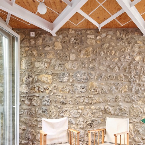 The interior of the renovated house is organized in three bands. First a longitudinal space parallel to the terrace. It is accompanied by an altarpiece formed by a succession of niches, a porous bottom that accommodates furniture and service spaces. Finally, behind it is the longitudinal staircase that extends the lower house to the top floor.