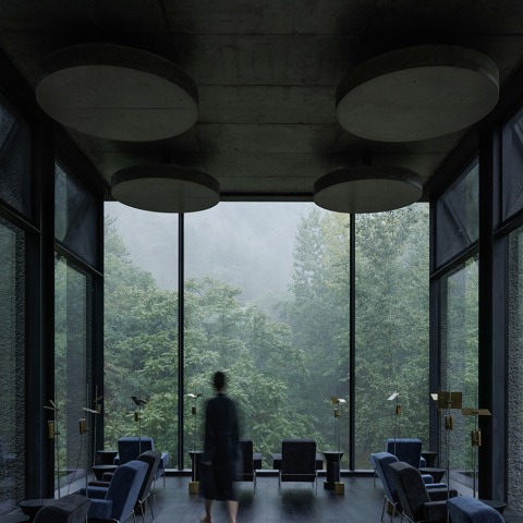 The third-floor bath pools, at different temperatures and water treatments are distributed under eight light wells. When the skylight passes through the 8-meter-high wells, it becomes soft and quiet, diffused by the bush-hammered concrete. Through strip windows above the water surface on the west facade, people can choose to immerse themselves in the water or have a glimpse of the nearby valley cliffs with the flourishing treetop enveloping the building.