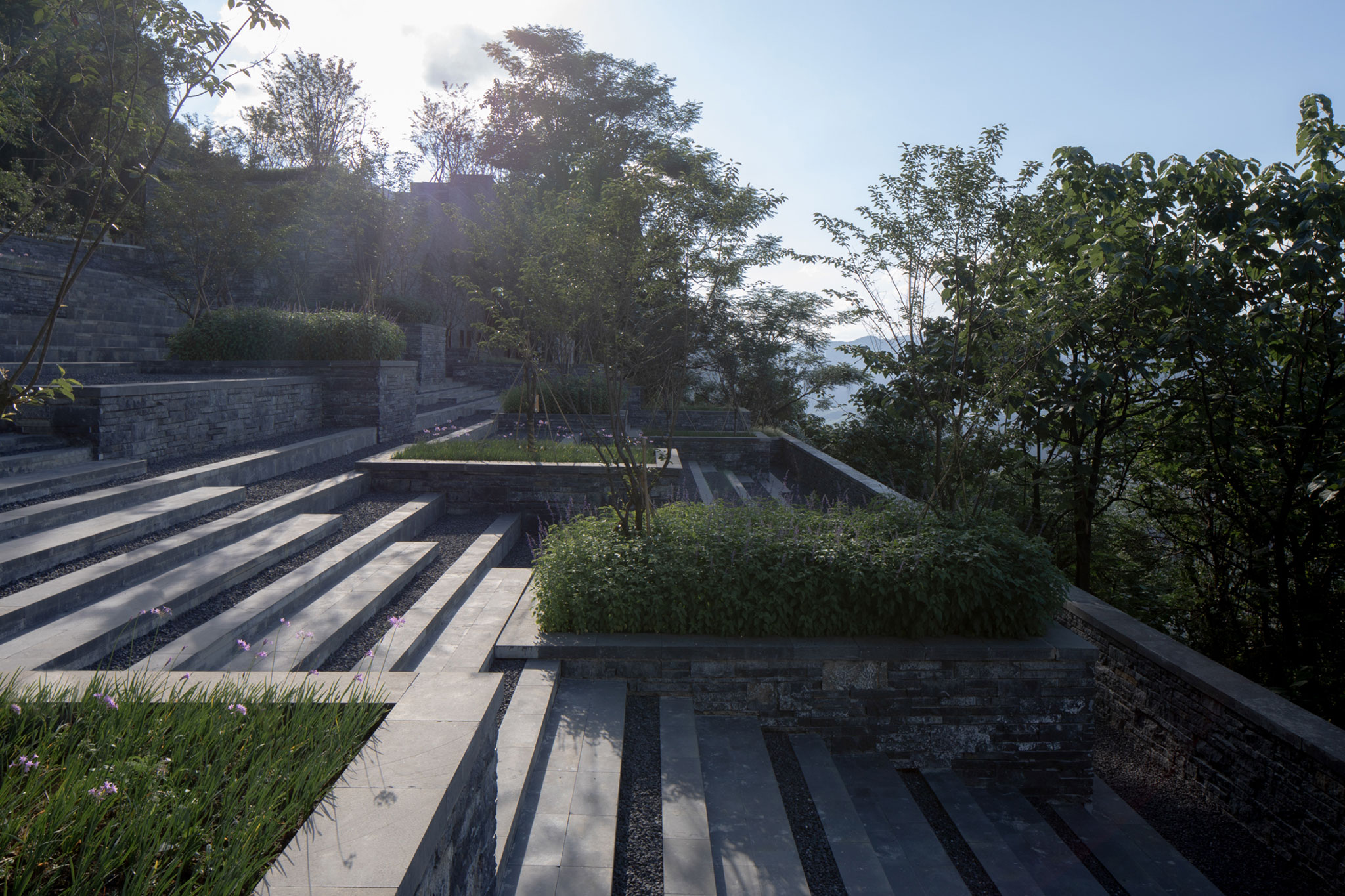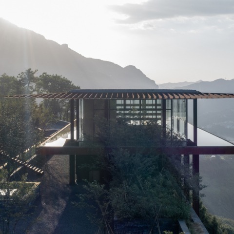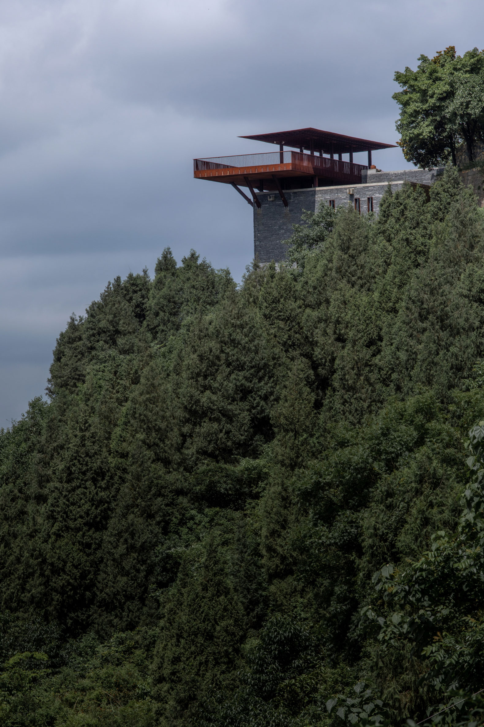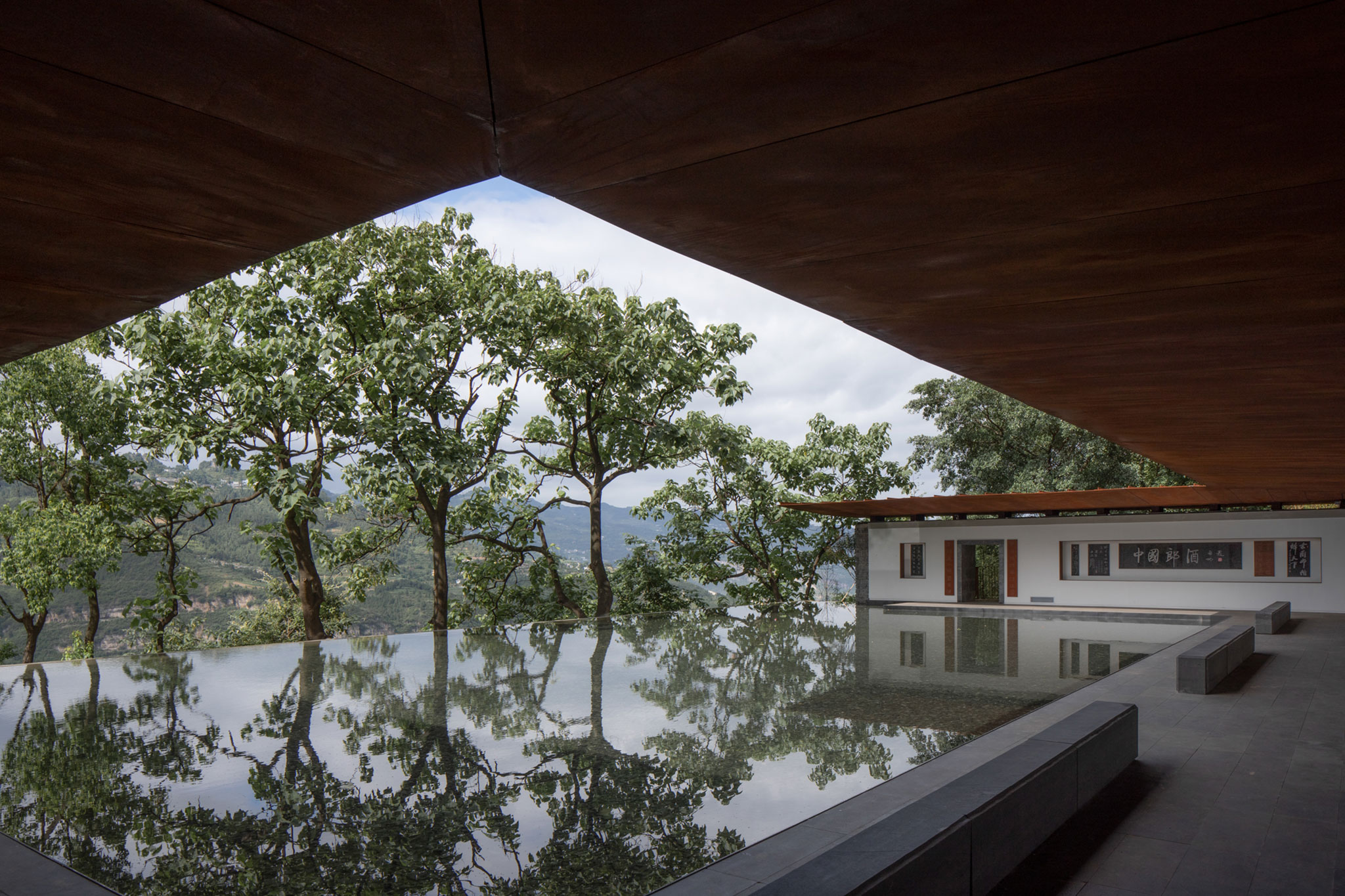 The Reception Lounge. The weathering steel pavilion cantilevers on the foundation bed that visitors are able to overlook the natural beauty. The interior of the foundation bed is a reception hall. The long horizontal window facing the Chishui River provides a photo frame of distant mountains.