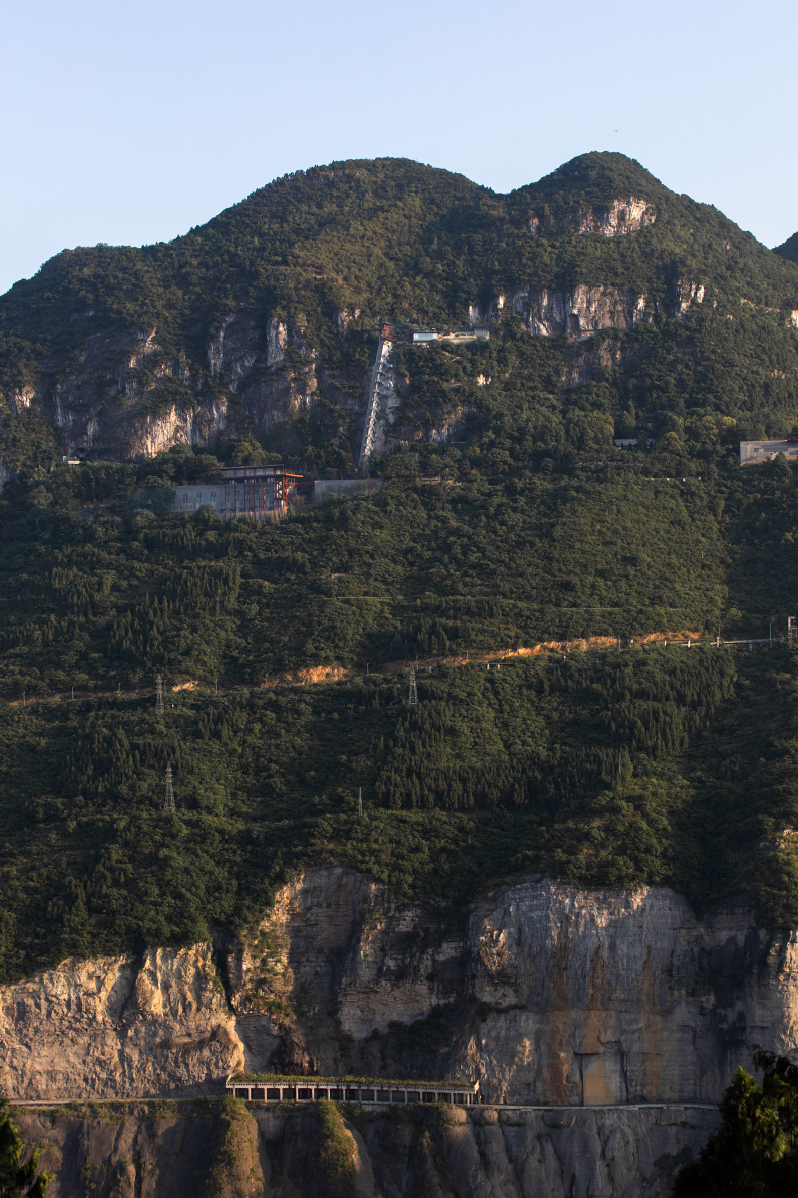 The Sloped Elevator & Cliff Restaurant & Renhe Cave. The sloped elevator stands up to the mountain, connecting the Cliff Restaurant and Renhe Cave.