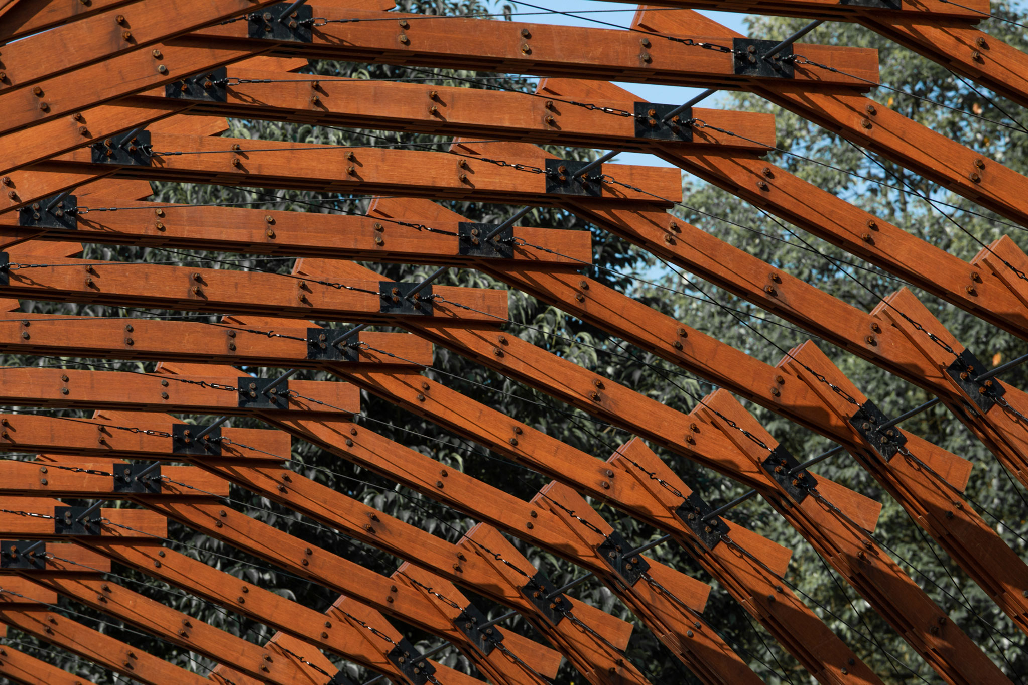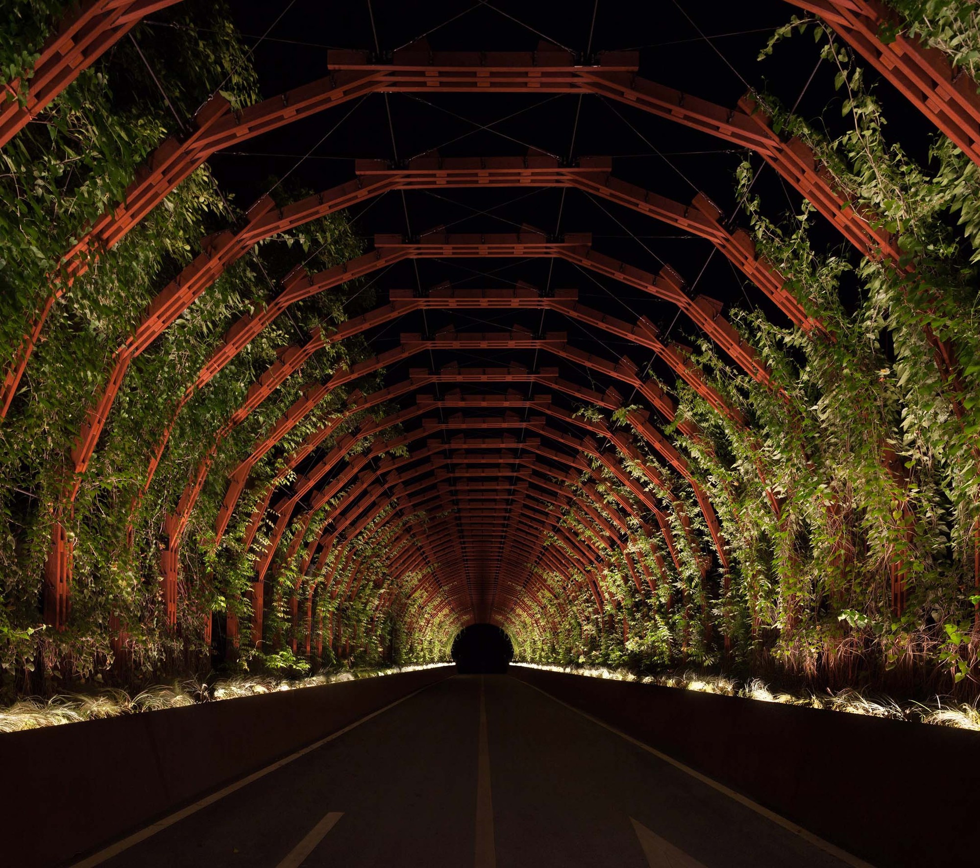 Entrance Pergola. Composed bamboo and steel together construct a sixty-meter-long green tunnel, giving people a strong sense of space. The heliophilous trigonometry climbs as time goes by, swaying the shadow.