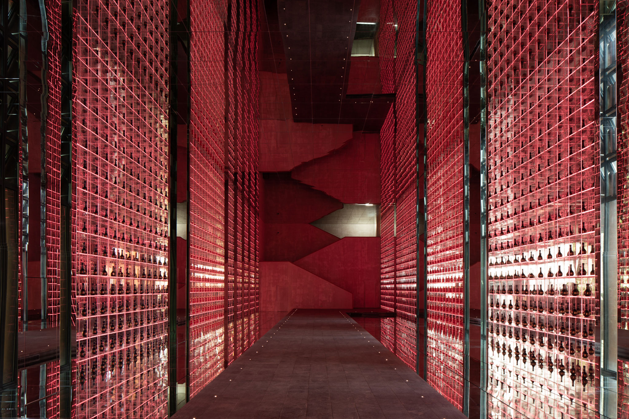 Continuing the tour, you reach the Poetic Liquor Courtyard, a U-shaped building that opens onto the landscape and features a pond in the courtyard that reflects the surroundings. Inside, the production of various Chinese liquors is explained. This courtyard connects to the Tree Courtyard, a roof made of the same aged steel that was previously used and sheltering trees that grow through the roof, thus demonstrating respect for the environment.