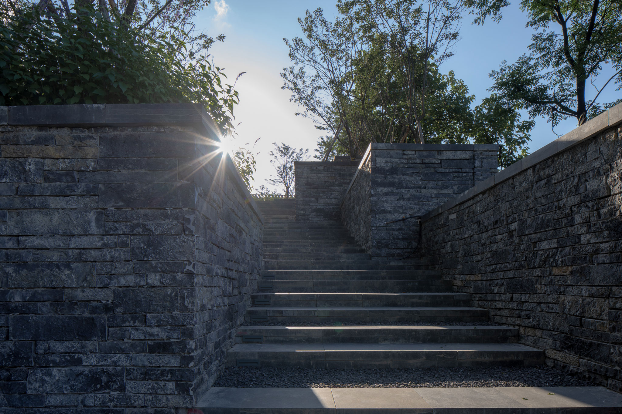 Material and Construction. The fair-faced concrete and the local stone are piled up and integrated into the landscape, forming the bed of basic functional areas. The orange-red weathering steel framework is cantilevered over the bed, lightly floating in the sky, which conveys the Oriental classical imagination dwelling in nature.