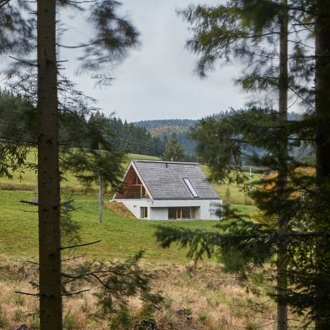 The design of the house is driven first by its materiality, Heaviness and lightness. The architect used concrete and larch wood with open views into mountain scenery. The concrete shall turn grey and overgrow with moss, the larch wood shall gain greyish-silver patina, and the access path from sandstone stones shall be barely seen in the meadow grass.