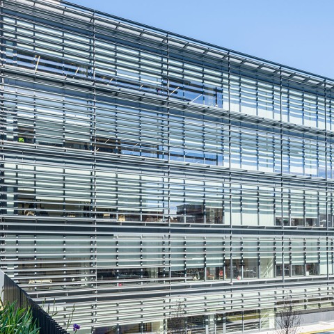 The most noticeable change to the public is its façade, consisting of the replacement of the 140m long North and South façades, with high quality glulam timber framed glazing to the North and minimal aluminium frames and louvres to the South, responding the a range of existing conditions and respectfully reflect the beautiful University of Madrid Mining and Energy Faculty building on the opposite side of the street.