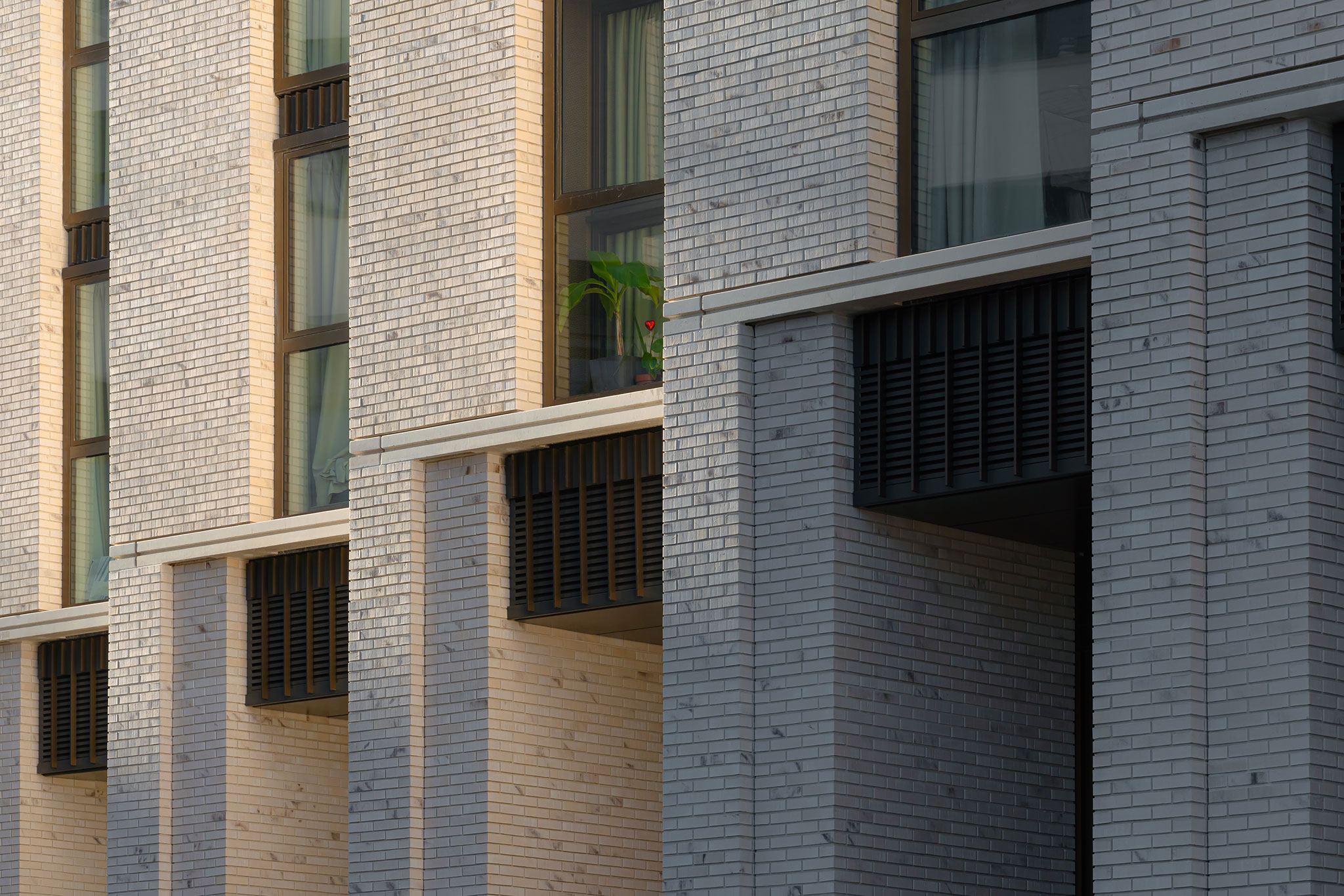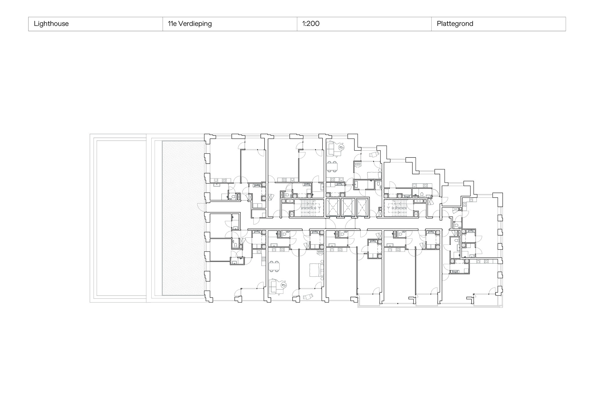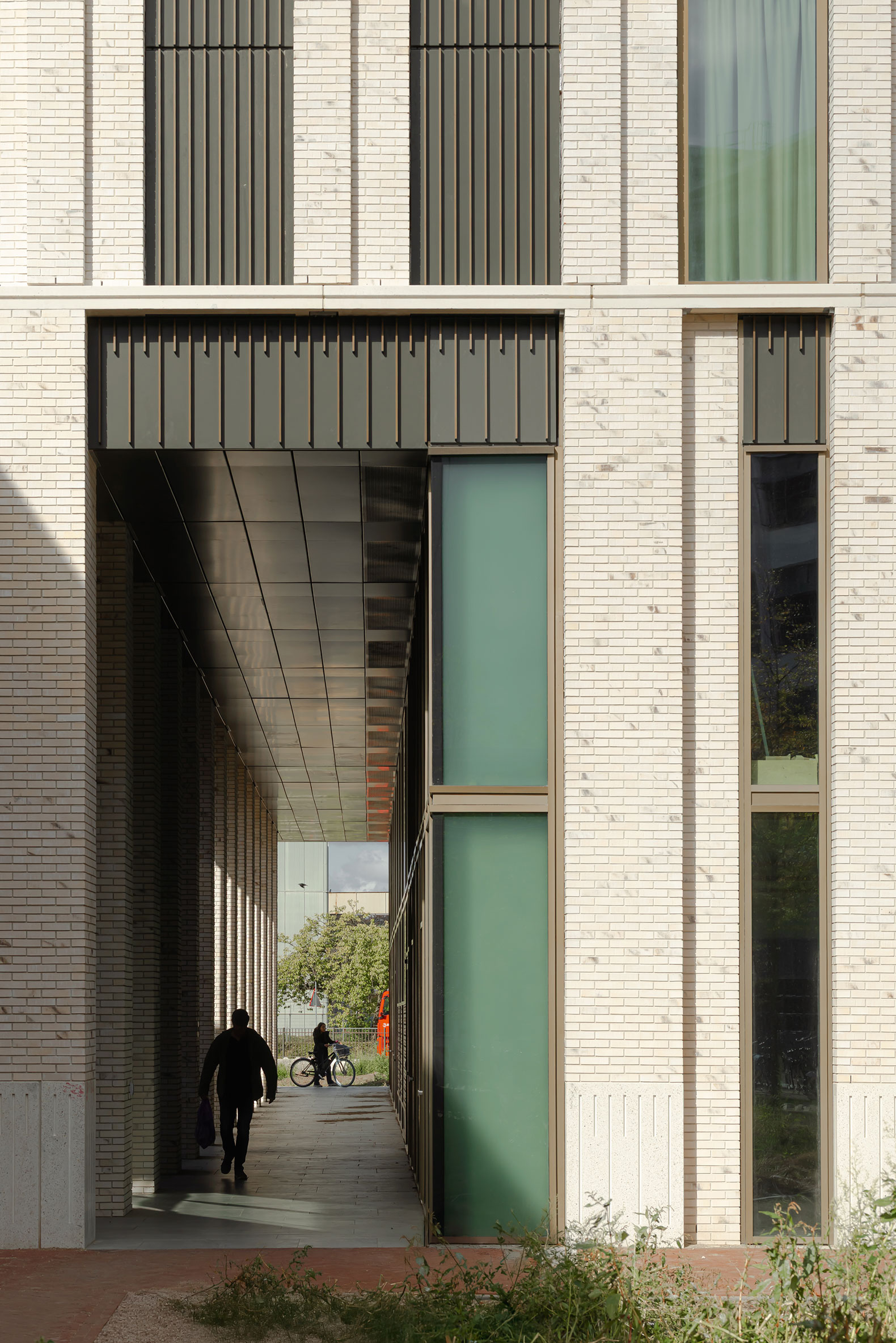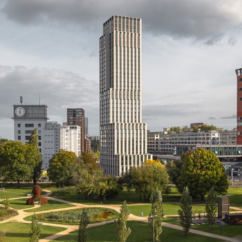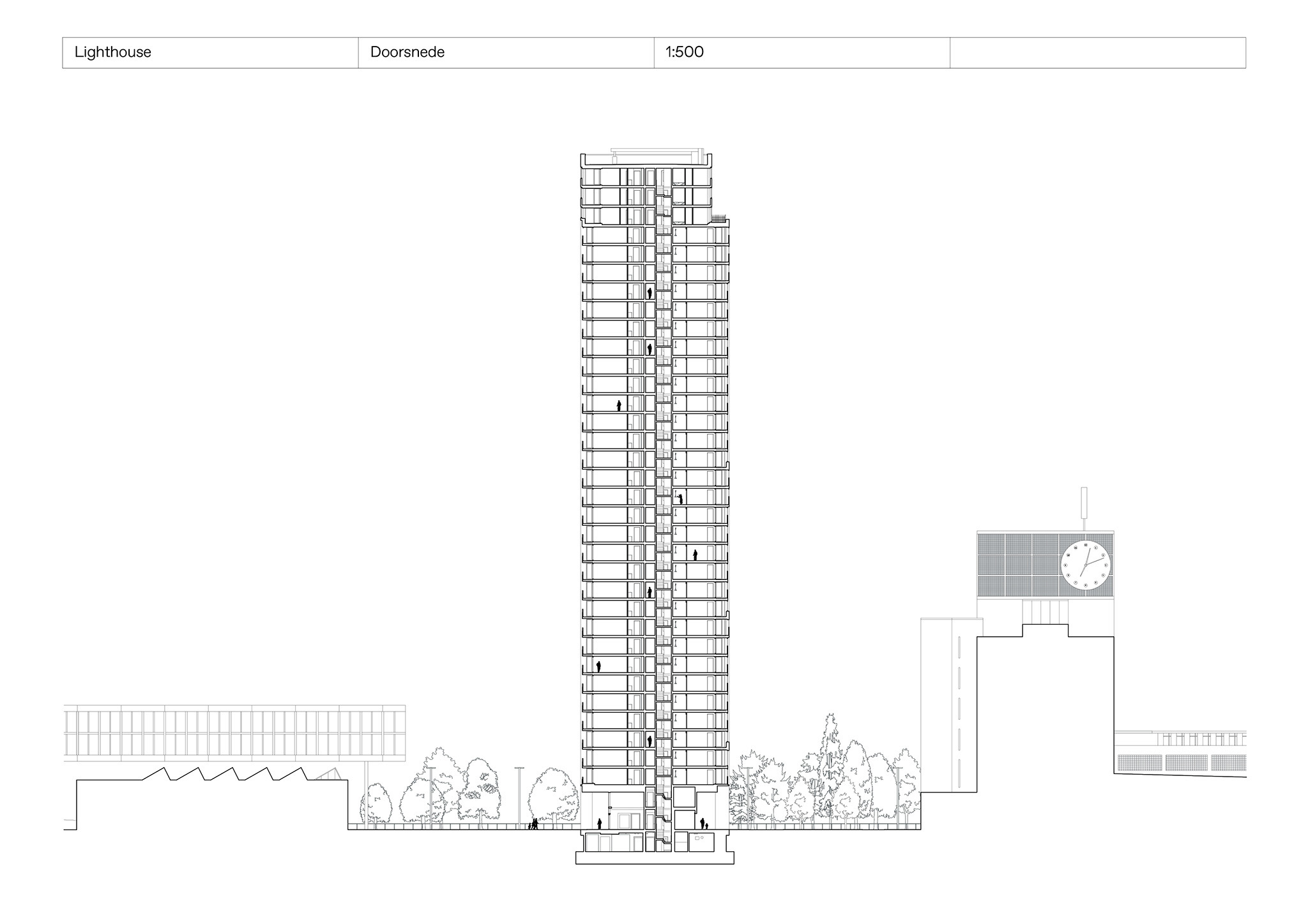 The architecture of "Lighthouse" exemplifies craftsmanship. From the plinth to the crown, attention has been paid to the materialization and detailing, in the tradition of Dirk Roosenburg, the architect of many of the early Philips buildings. "Lighthouse" is constructed from four materials: brick, concrete, aluminium and glass. Where the building tapers, horizontal lines and space for communal roof gardens emerge. The diagonal line of the building is emphasized by an impressive serration, which connects to the monumental colonnade on the square adjacent to the Machinekamer. This is also where the striking entrance to the residential building’s lobby and amenities is located.