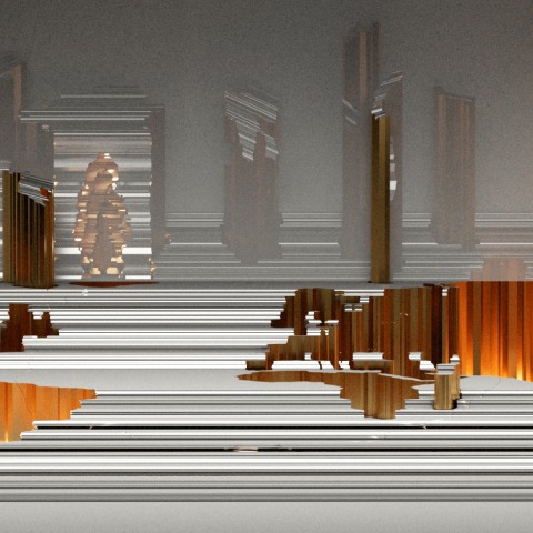 El escenario estuvo ocupado por una enorme escalera, con diferentes formas geométricas dispuestas al fondo, simulando rascacielos futuristas, o tal vez, por el contrario, pilares antiguos.