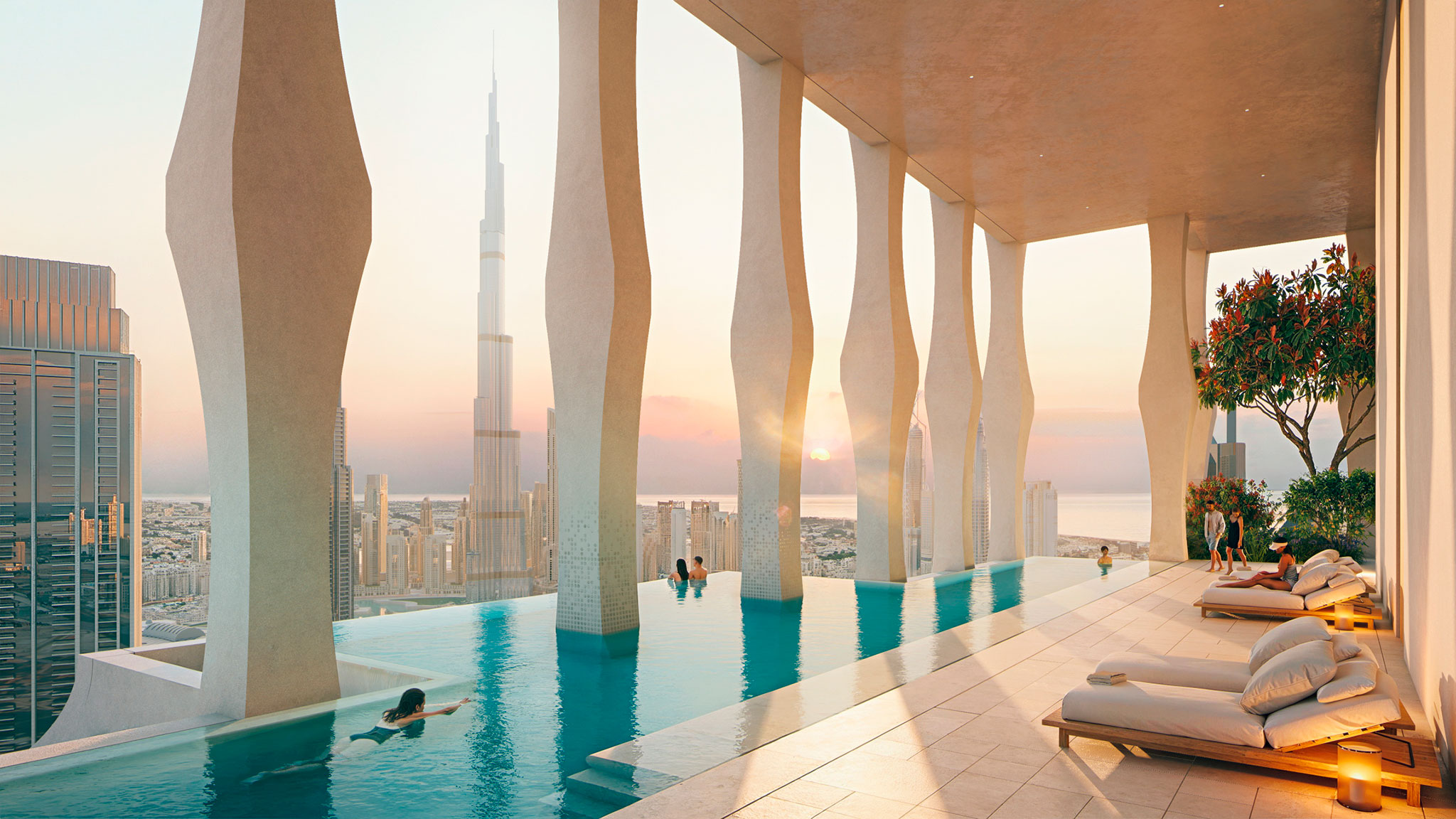 The Janu Hotel tower offers a ceremonial yet intimate arrival, framed by layered landscaping and a vertical 18-meter-high lobby. Directly accessible from the drop-off, the lobby connects hotel guests to a suite of amenities situated above, including a spa, fitness facilities, wellness center, dining terraces, multiple restaurants, a club and lounge all oriented around framed views and shaded outdoor spaces. The hotel offers 150 rooms across five typologies, many featuring private terraces, gardens, or plunge pools. Above, the branded residences—located in the most sculpted and panoramic part of the tower—offer a range of configurations with expansive outdoor living areas and uninterrupted views of the Burj Khalifa and surrounding palatial gardens.
