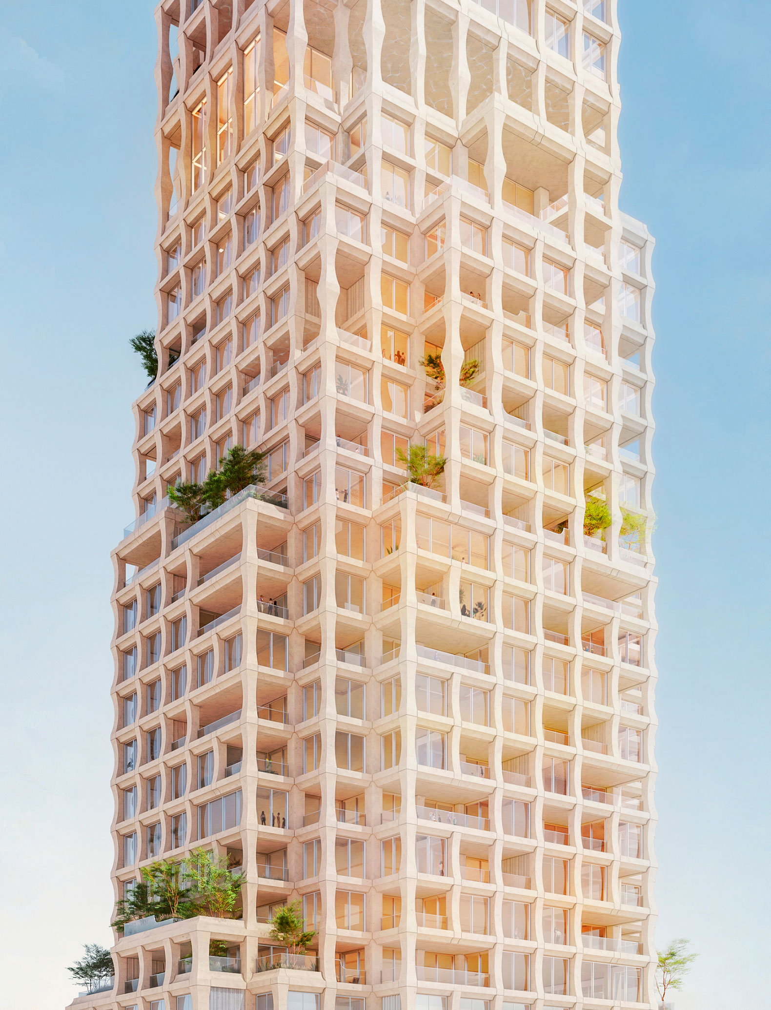 The towers depart from the sleek anonymity of surrounding glass skyscrapers. Their facades, conceived as stone forms gently shaped by wind, feature deep recesses and sculpted geometries that animate light and shadow throughout the day. The massing is articulated into stepped volumes and terraces, creating generous outdoor spaces with panoramic views. Freestanding sculptural columns frame exterior spaces and generate a rhythm of solid and void that filters sunlight, defines thresholds, and enhances spatial depth.