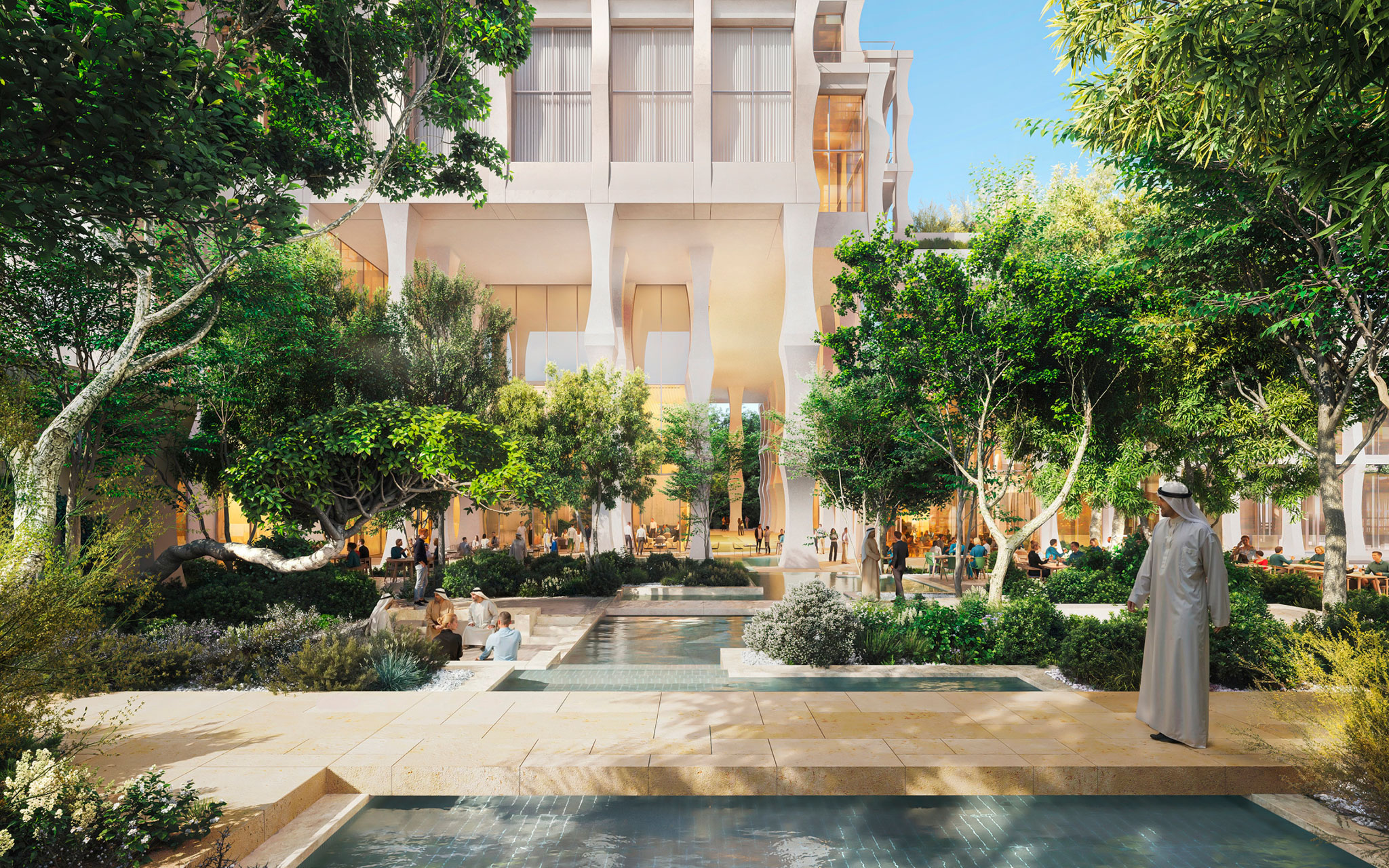 At ground level, a reimagined souk anchors the project—animated by retail and F&B spaces organized around shaded courtyards. The towers’ stepping volumes create both street-level gardens and accessible rooftops, forming an immersive, walkable environment that reinterprets the traditional souk. The landscaping integrates existing Ghaf trees and other indigenous species, ensuring biodiversity and grounding the project in local ecological heritage. Water features, shaded planting, and natural materials combine to create microclimates that reduce heat and enhance comfort throughout the year.