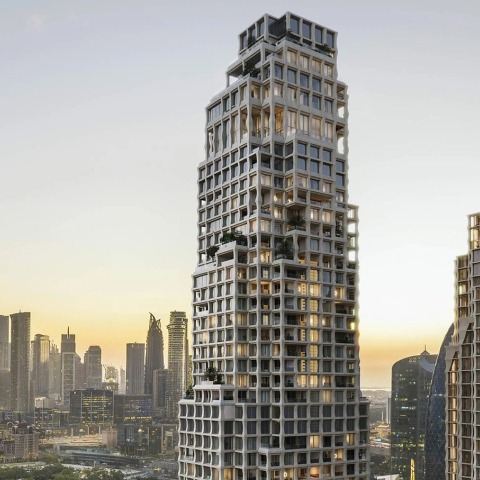 Inspired by vernacular architecture and early modern structures in Dubai, Herzog & de Meuron's project pays particular attention to climate efficiency. Self-protecting facades, staggered volumes, and wind-channelling geometries reduce solar radiation and enhance comfort. In contrast to conventional glass towers, the building presents itself as a mineral element, with deep recesses, freestanding columns, and plays of light and shadow.