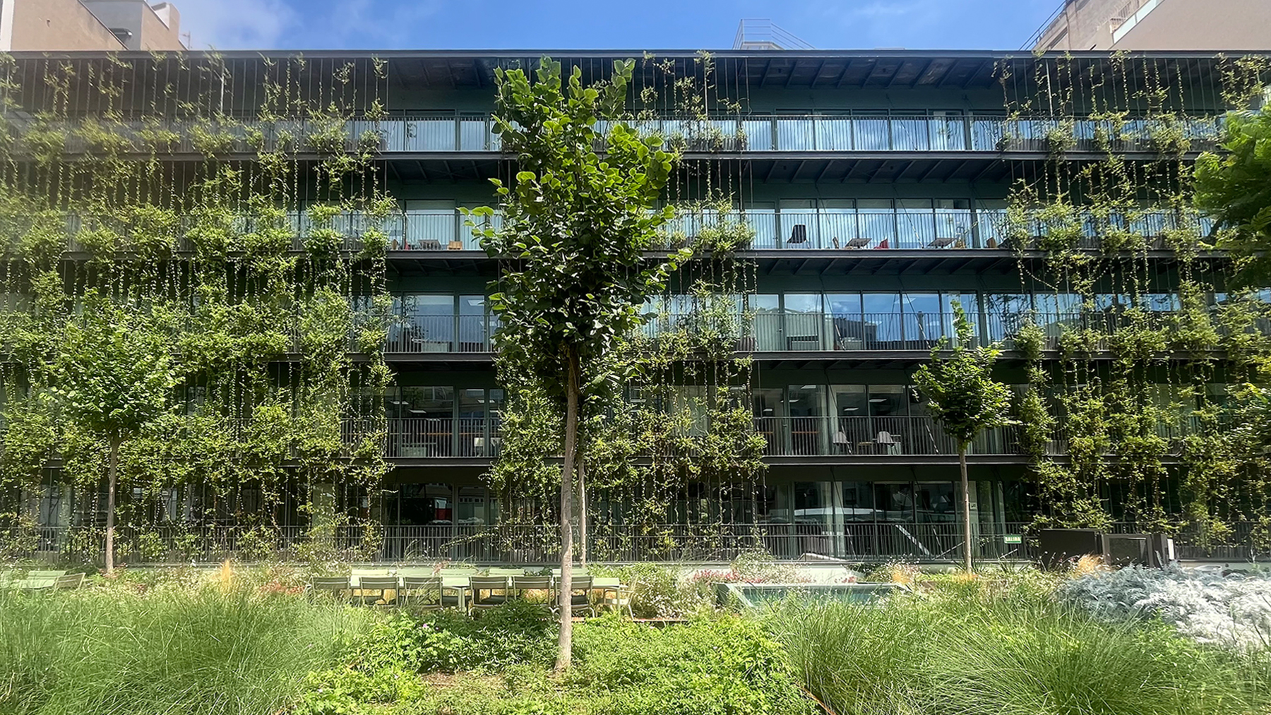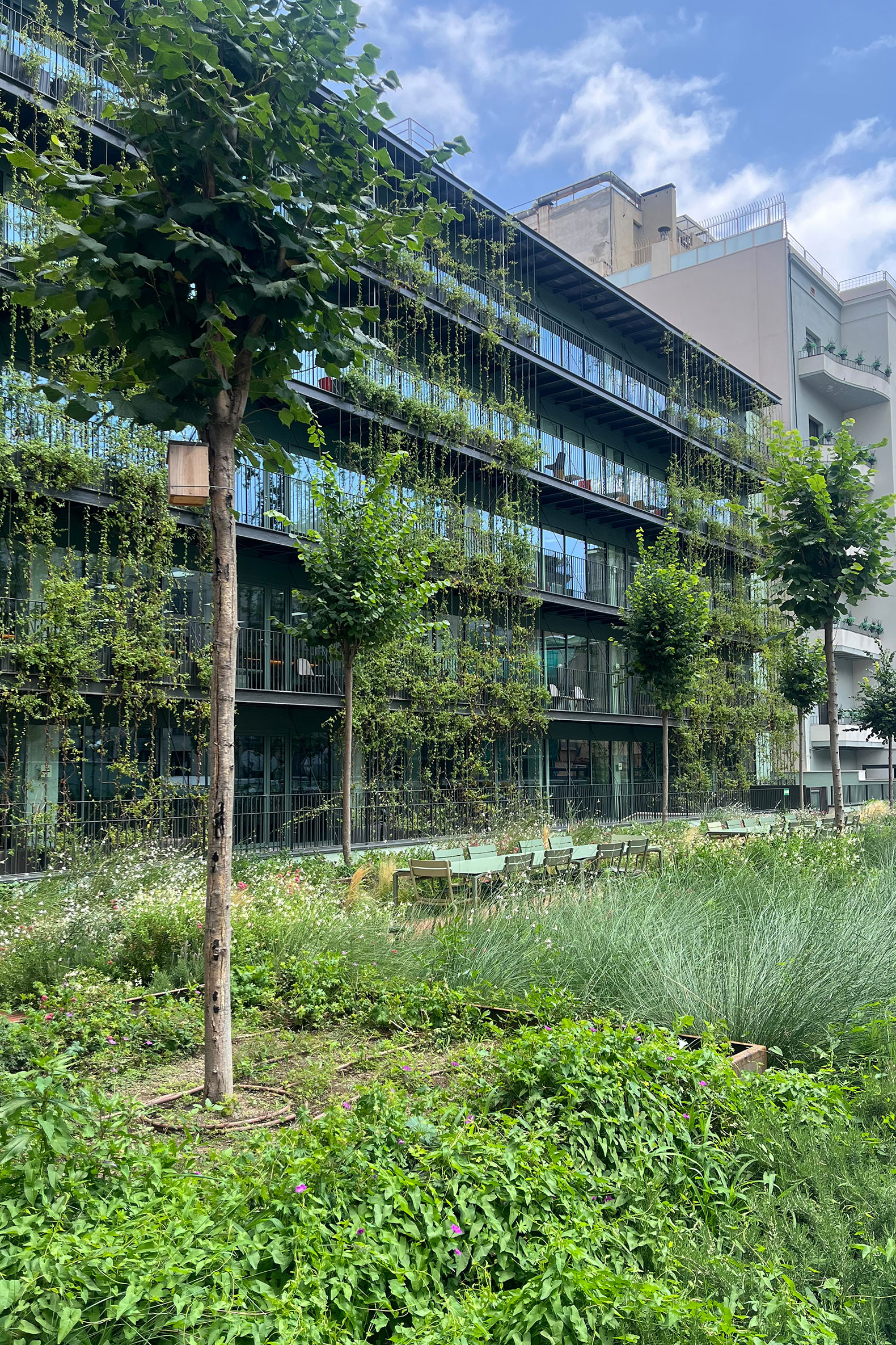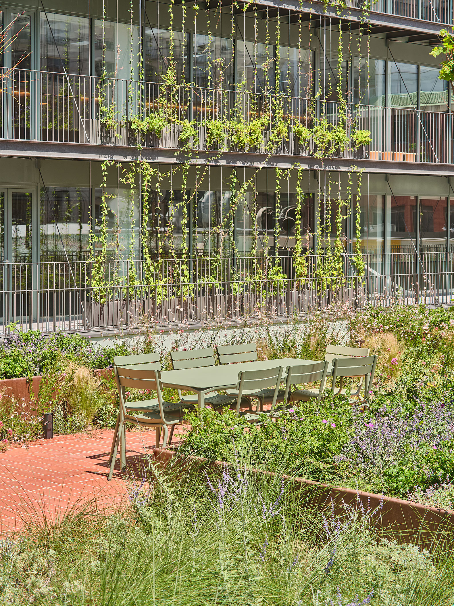 The interior façade facing the courtyard fosters a connection between the offices and the garden, providing large, continuous balconies composed of prefabricated metal modules, assembled on-site and incorporating climbing vegetation. These balconies offer protection from the southwest sun and passively improve energy efficiency.