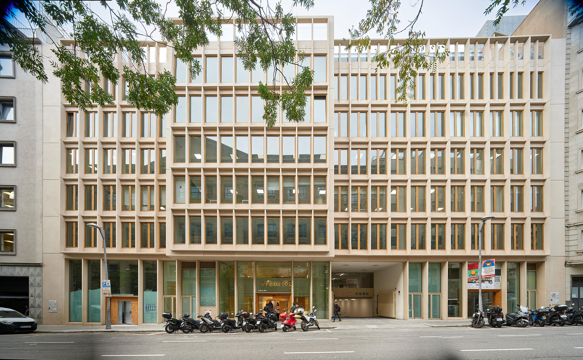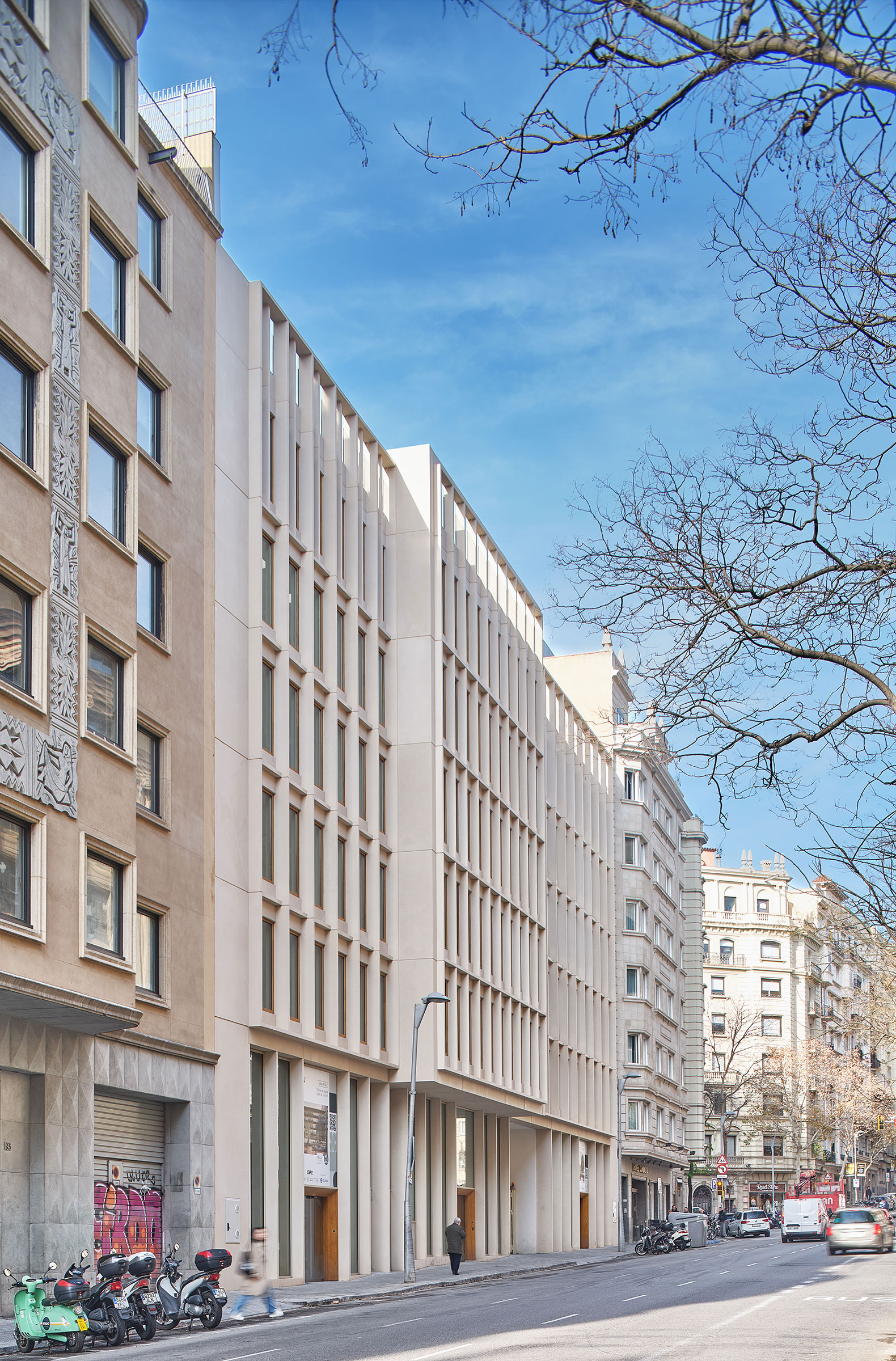 The project utilizes and enhances over 80% of the original 1986 building structure. The main façade, facing Aribau Street, is integrated compositionally and chromatically into the Eixample district's urban environment with prefabricated concrete elements that emulate the Montjuïc stone, which is prevalent in the surrounding urban façades. The interior facade facing the courtyard promotes the relationship of the building with the garden through large continuous balconies of prefabricated metal modules.