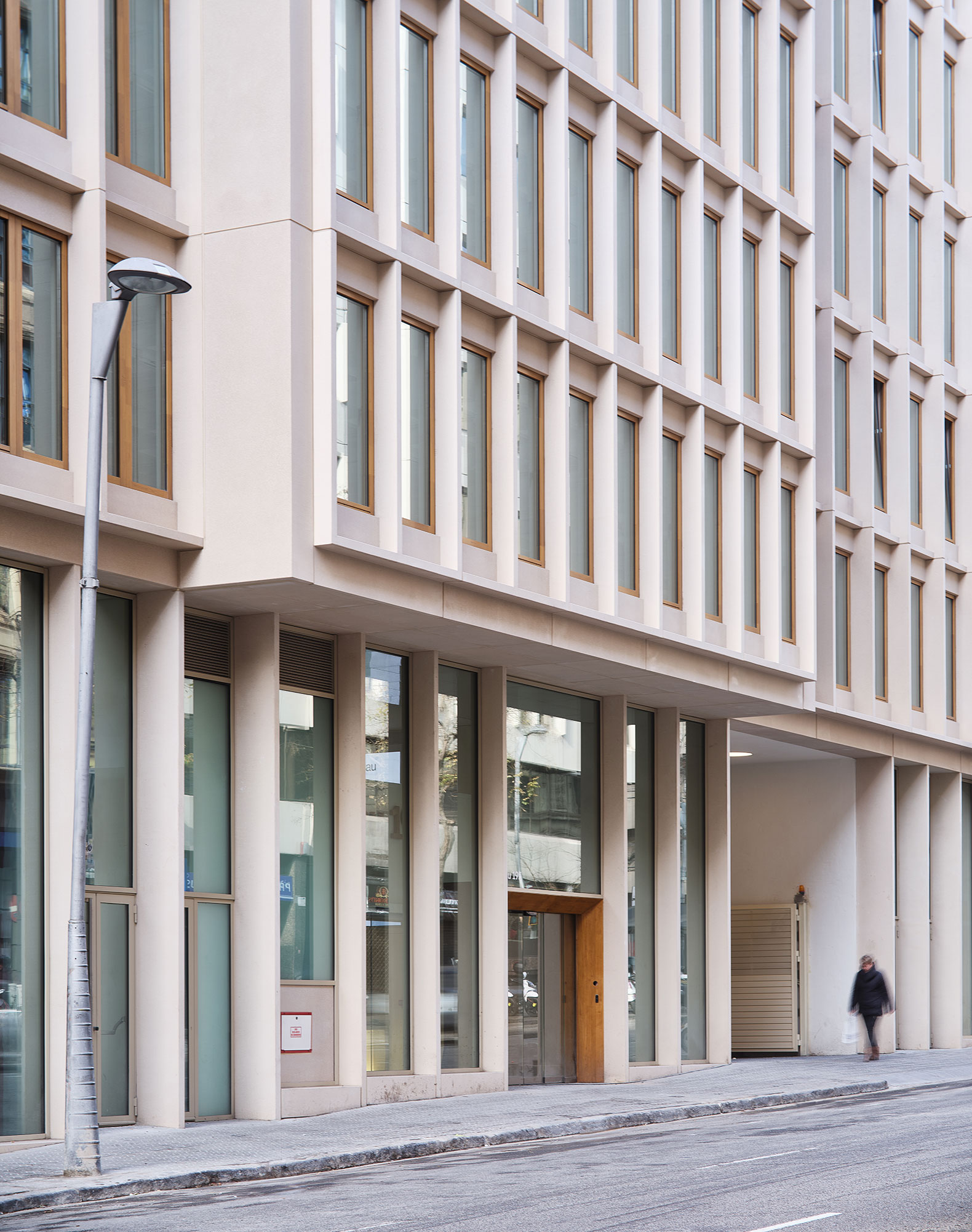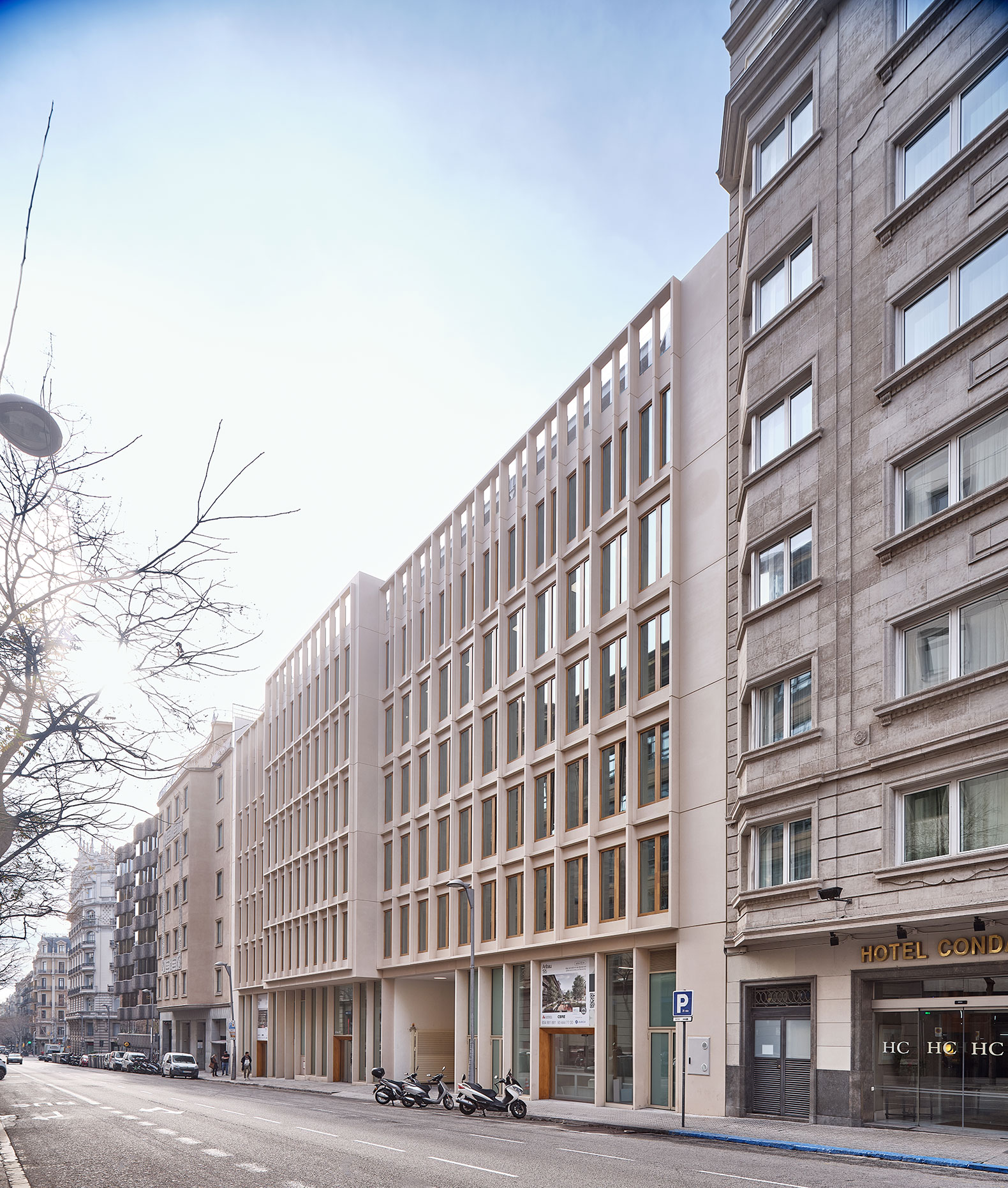 The main façade on Aribau Street prioritizes compositional and chromatic integration. To achieve this, a prefabricated, high-density architectural concrete element was designed specifically for the building. This element emulates the Montjuïc stone—now lost—and provides order, rhythm, and color in harmony with its surroundings. The building thus revives the tradition of stone façades with wooden windows characteristic of Eixample buildings.