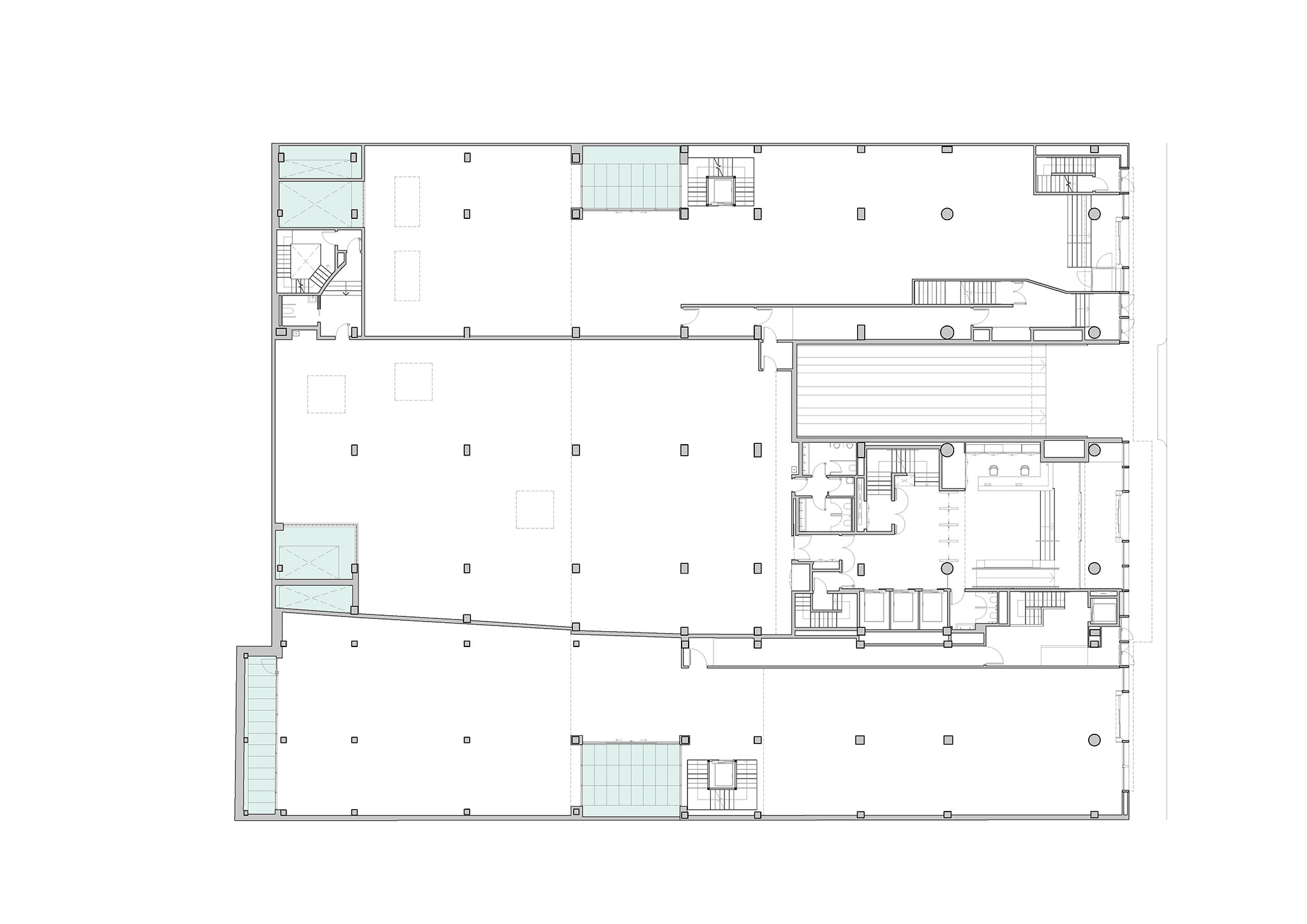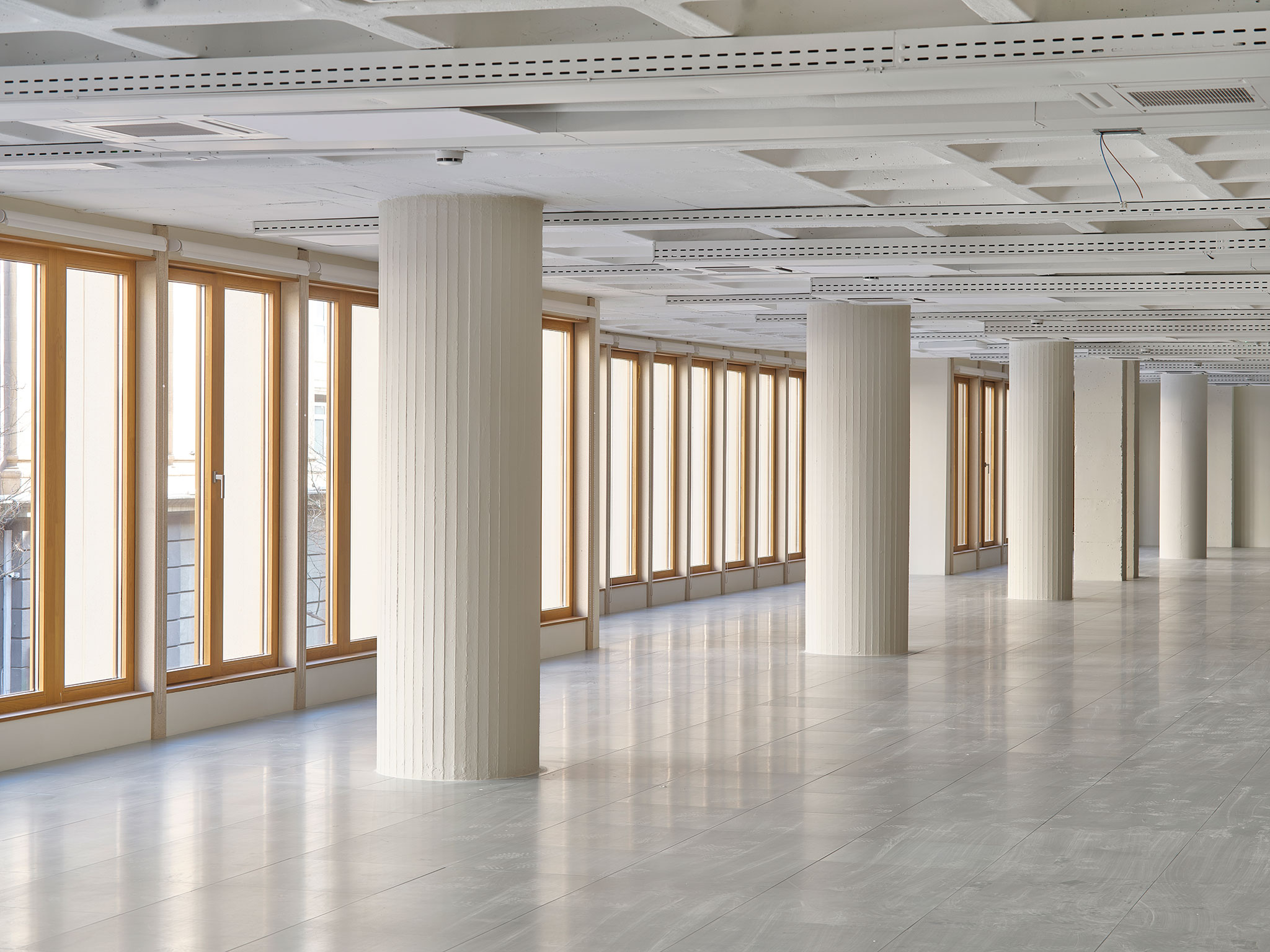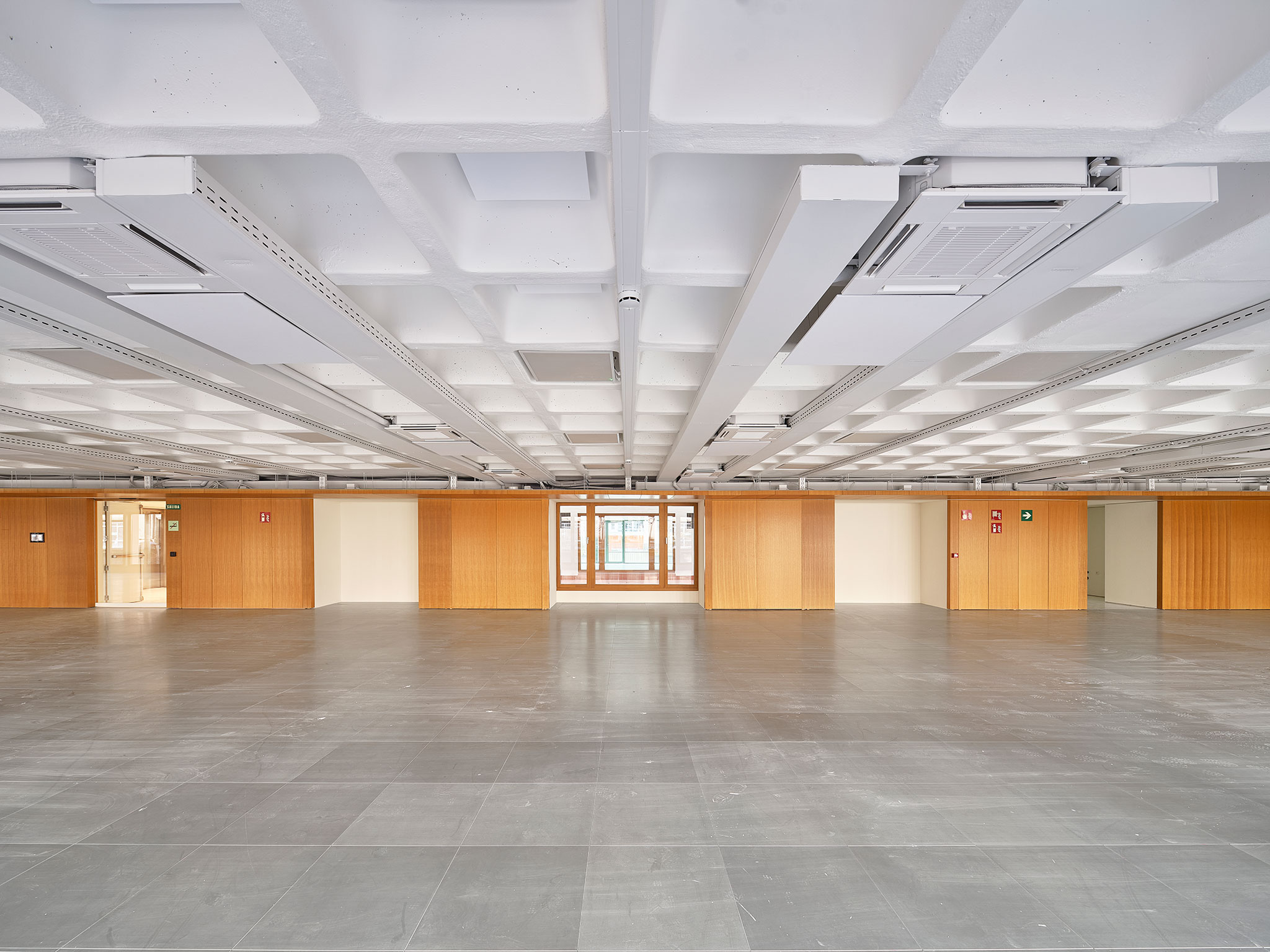 The interior layout groups the fixed elements and building services in the center, offering flexible, open, and luminous interiors with natural cross-ventilation. The renovation highlights the original structure of this space, leaving the waffle slab with its recoverable coffers exposed as a focal point, while integrating all the building services. This solution integrates the existing structure with the new installations and allows the entire floor to have the necessary height for office use, extending the building's lifespan.