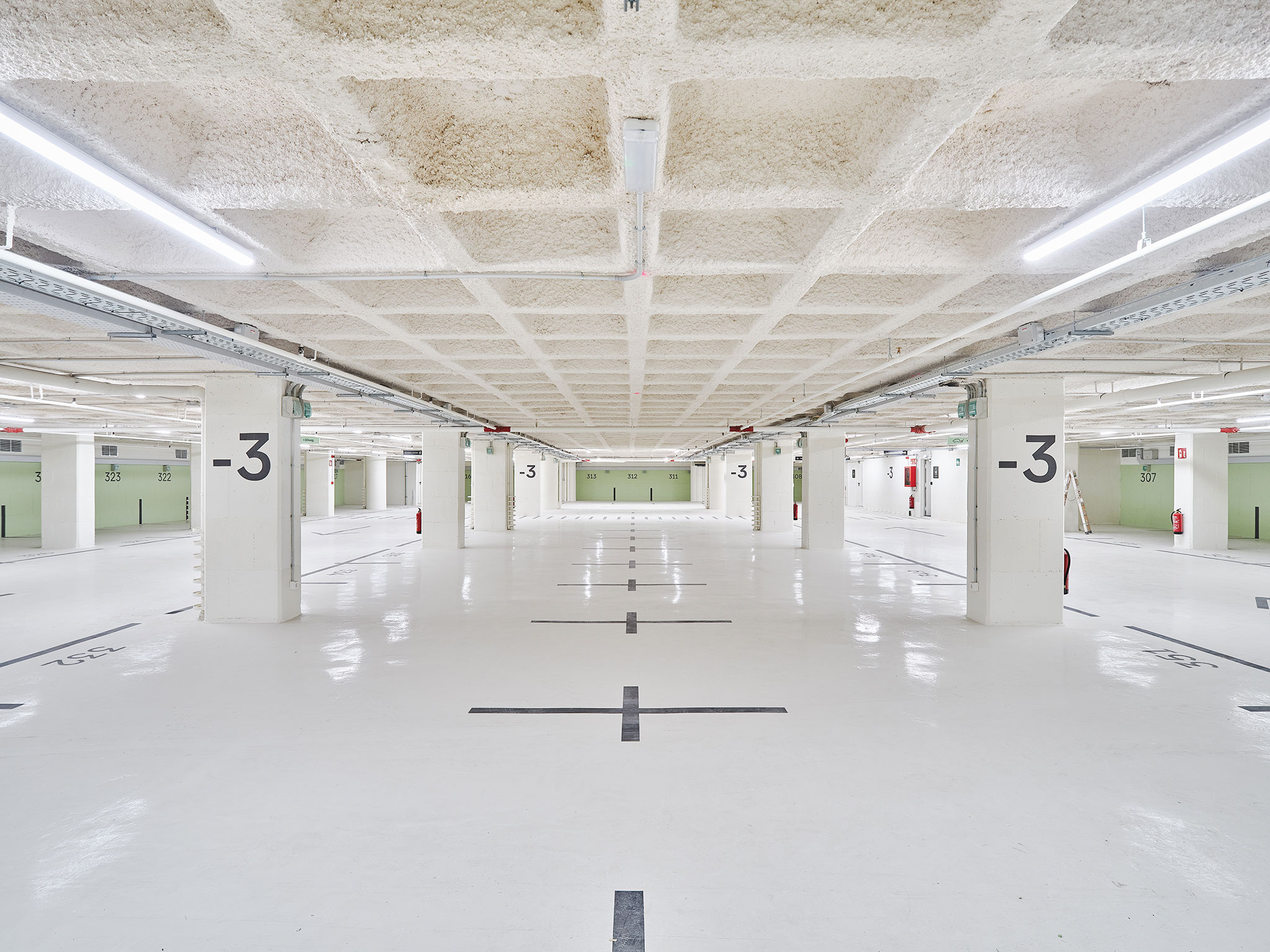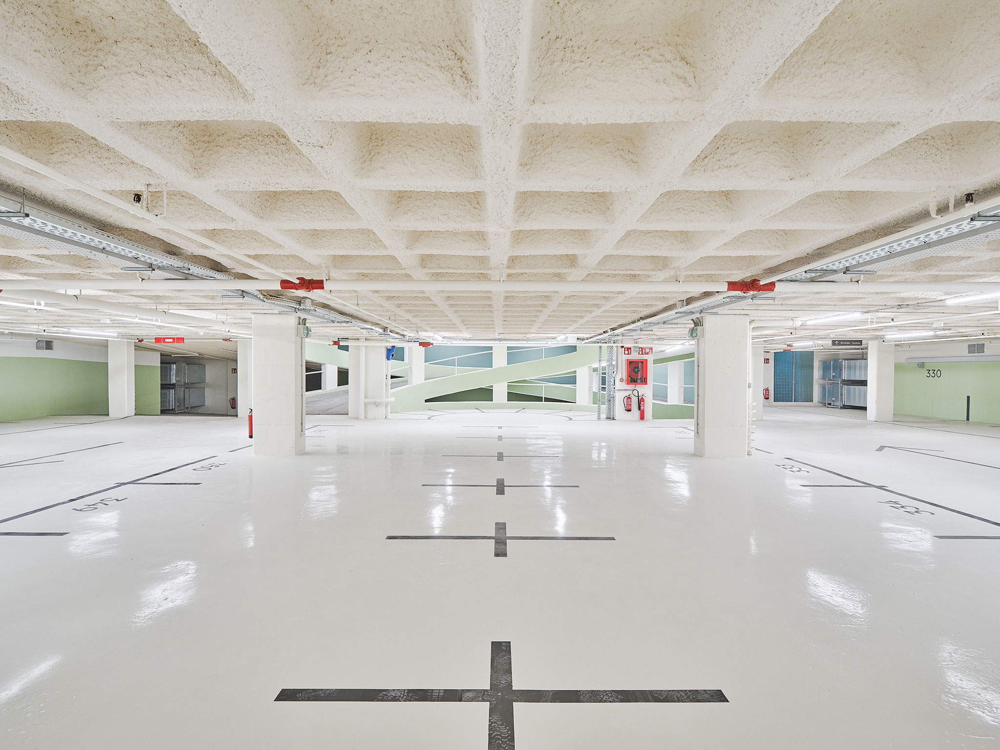 The building's parking garage, with natural light and ventilation, and a large area for bicycles and scooters, has been completely remodeled using the same green color scheme.