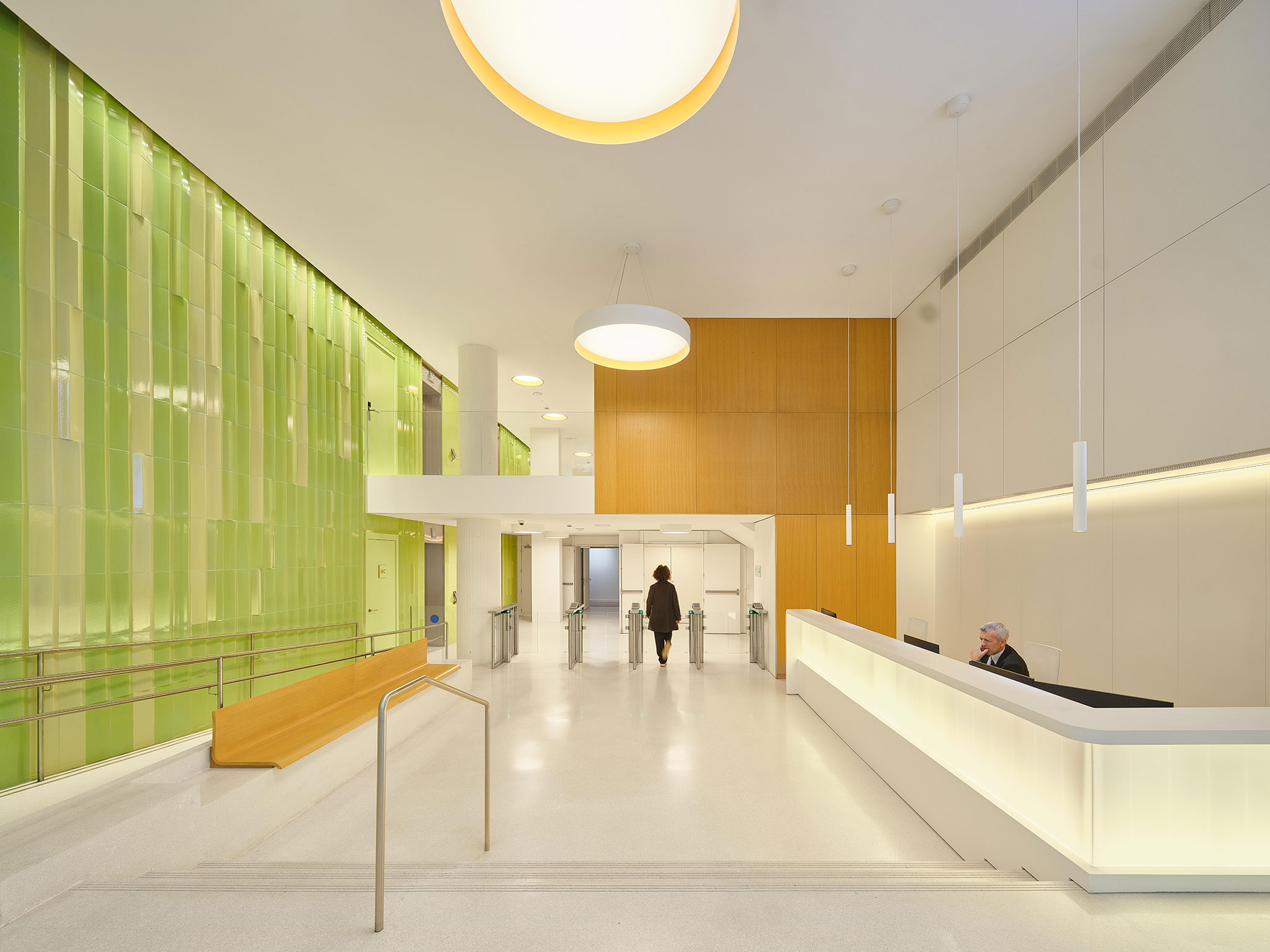 The building's main entrance features a spacious, open-plan area with two levels. On the left, a striking ceramic composition in shades of green stands out, the color palette that will be used throughout the project. This composition creates textures that change with the light throughout the day.