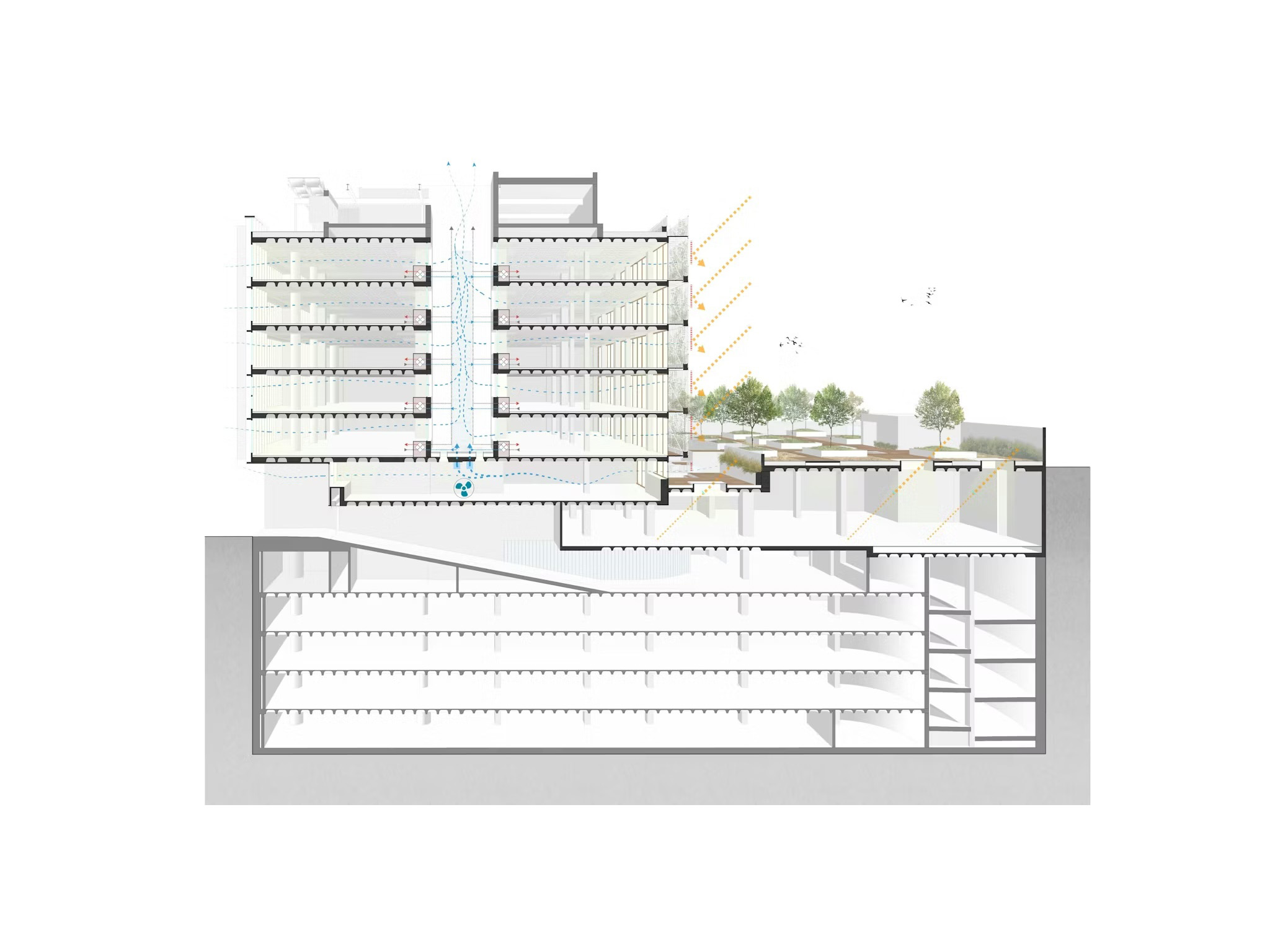 Both façades, along with the green roofs, prioritize bioclimatic performance and seamless integration with the surrounding landscape.