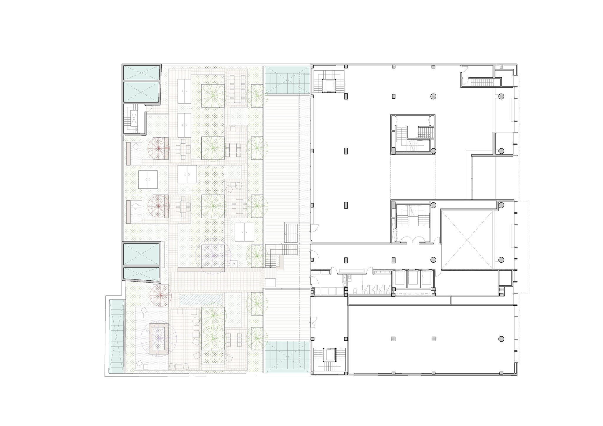 Creating outdoor spaces in the courtyard, for resting, eating, walking or exercising during the day, has been another priority action of the project, to make it a more natural, fresh and friendly place, designed for the well-being of users, neighbors and ultimately, the city.