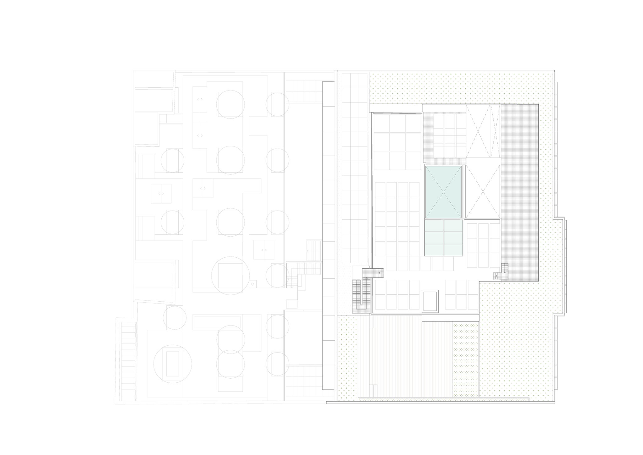 The project renovates and expands a pre-existing office building and its interior courtyard, which houses building services. It utilizes over 80% of the original structure, promoting the volumetric, compositional, and material integration of the entire building within the context of Barcelona's Eixample district.