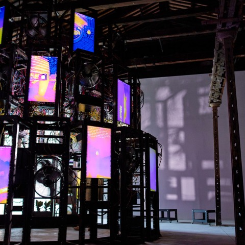 The experience invites the viewer to immerse themselves in an interactive exhibition, in which they can visualize how people are constantly producing and disseminating heat and data around the world. Sixteen screens display real-time thermographic imaging technologies and 24 fans generate cool air as a contrasting reminder of the heat produced by data centers, all fixed to a frame of charred materials.