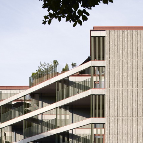 With a compact building volume as the starting point, the relationship to the neighboring buildings has resulted in a more oblong shape. This does justice to the potential of the plans and makes more out of the space in between the towers. Each housing unit gets similar qualities in a flexible plan, with light from two directions, large balconies, and extra floor height. Double-height balconies bring the light deep into the apartments. Different sizes of apartments ensure a varied housing environment.