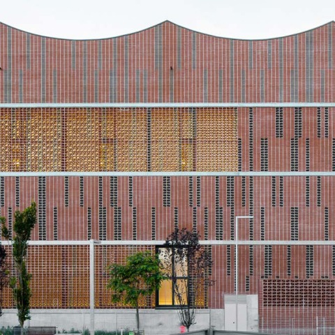 The construction system is based largely on brick, deliberately revisiting the old factories, warehouses and workshops that are so numerous in the area. The construction and materiality of the building constitute its formal expression, its finish, with no added elements. The brick thereby has a high profile. The low maintenance bare brick façades alternate empty and full, opaque, translucent and transparent parts, and masonry units of different formats and colours with the aim of lightening the whole, giving the built volume a texture, a grain, a vibrant pixelation, while also adapting to the different orientations. We see brick lattice walls on exposed façades protect the courts from direct sunlight and possible glare, and, conversely, large glazed expanses in the lower part of the north-facing façade, opening up to the entrance concourse. The above ground volume of the building is finished off by a roof of gently curving, inverted vaults that is integrated into the context, somehow suggesting the order and presence of the roofs of neighbouring warehouses. This curved-line finish helps to lighten the volume of the complex and constitutes part of its formal expression.