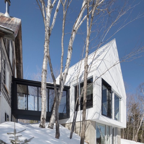 On the vast Lac Ouareau, located near the town of Saint-Donat, sits a charming traditional house surrounded by birch trees. The owners, a dynamic stepfamily, commissioned ACDF to design for their many children a larger area to play and relax. In order to make sure everyone in the family can find a peaceful corner when spending time together, the architects created an addition that mirrors the original building’s dimensions. The extension preserves and pays tribute to the historic house while reflecting the beauty of the landscape it inhabits.