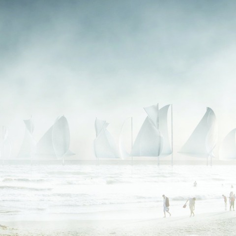 LAGI 2016 was an ideas competition to design a site-specific public artwork that, in addition to its conceptual beauty, has the ability to harness energy cleanly from nature and convert it into electricity and/or drinking water for the City. "Regatta H2O: Familiar Form, Chameleon Infrastructure" by Christopher Sjoberg and Ryo Saito has been the winner of the contest, proposing a set of 44 candles made from a high-tech mesh material that is capable of "harvesting" the usual Coastal fog to generate up to 112 million liters of drinkable water per year. Veins on the surface of the candles would serve as collectors of ambient humidity, funneling the collected water to a central mast, which would in turn pump the liquid to a set of storage containers on the shore.