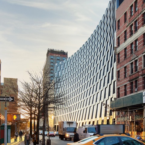 In 1912, the Equitable Building in Lower Manhattan was designed to be the largest building that could fit its site and rose skywards from the street lot-line without any setbacks. The building has since served as the prime example of the perils of unregulated development and as a result, the first building regulation in the United States was born. The landmark 1916 Building Zone Resolution enforced the construction of "stepped façade" towers in order to allow light and air back into the streetscapes. BIG’s reinterpretation of the resolution is demonstrated in The Smile with its scalloped façade. Draped between two existing buildings, The Smile gently curves inwards as it rises upwards to bring ample daylight into the residential streets while enlivening and connecting to the lively Harlem neighborhood.