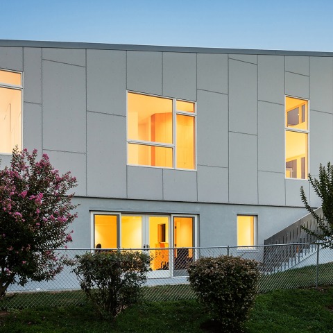 Esta casa utiliza una sola pendiente para dar cabida a dos plantas y media: una zona parcialmente independiente de sótano con una habitación extra en la parte de arriba. La línea de techo continuo crea un volumen interior espectacular para el salón, y se adapta a la habitación extra, un altillo. Un área de estudio con doble altura conecta los dos espacios. La carpintería, de encargo, se extiende en toda la altura de la sección haciendo hincapié en el alto volumen espacial.
