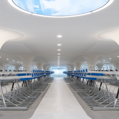El edificio se dispone de una entrada monumental con puertas acristaladas siempre abiertas, para facilitar la iluminación natural en el interior, donde predominan el blanco y la luz. El recibidor dispone de un sistema automatizado que facilita el registro del ciclista con su tarjeta de transporte, o bien por medio de un dispositivo que se integra en la bicicleta.