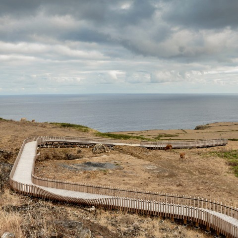 Rodeado en un escenario espectacular al sur de la isla e incorporado en un contexto geológico muy particular, se nos propusó recalificar el lugar Pedreira do Campo, irrebatible punto de interés educativo y científico sobre la geología de Isla Santa Maria. Por supuesto, la preocupación principal fue mantener la identidad de un lugar que es considerado Patrimonio Natural de los Açores. Así, hemos considerado dos pasillos peatonales diferenciados aunque complementarios. Uno de ellos sirve para explicar el fenómeno geológico, y el otro se integra en un pasillo existente que intercepta el nuevo. El pasadizo proyectado emerge del terreno rocoso e irregular como una pasarela, apoyada por solo algunos puntos. La impermeabilización del lugar, además de su importancia geológica fueron motivos para que el pasadizo solo acariciase el suelo.
