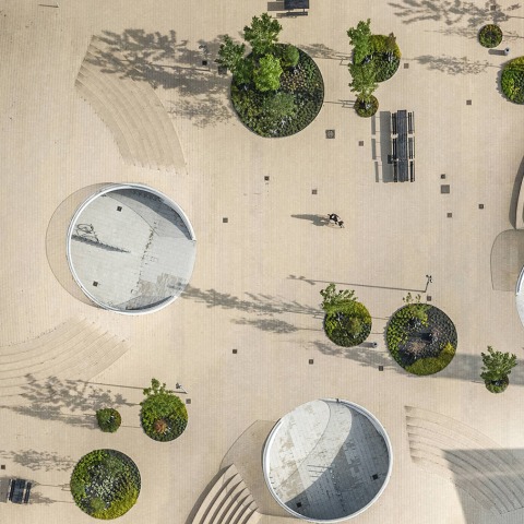 Las tres colinas para bicicletas se crearon como conchas de hormigón fundido revestidas con azulejos colocados a mano en colores que hacen eco de los exteriores de los edificios universitarios circundantes. Además de servir como un lugar de encuentro activo para estudiantes, empleados y locales, la plaza también contiene un espacio de estacionamiento de bicicletas de alta capacidad para los muchos usuarios de la universidad, incluidos 16.000 estudiantes y 2.000 empleados. El diseño innovador y único tiene espacio para 2.000 bicicletas.