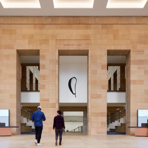 Dos bajorrelieves de yeso de gran tamaño, La carrera de Atalanta e Hipomenes y El triunfo de la flora, de Joseph Deschamps (francés, 1743-88), que se han situado en lo alto de los balcones de las paredes norte y sur desde la inauguración del museo. en 1928, se han restaurado y estabilizado recientemente, y una escultura de pared recién instalada, Generation (1988) del distinguido artista estadounidense Martin Puryear, adornará la pared en el umbral entre Lenfest Hall y Forum Gallery.