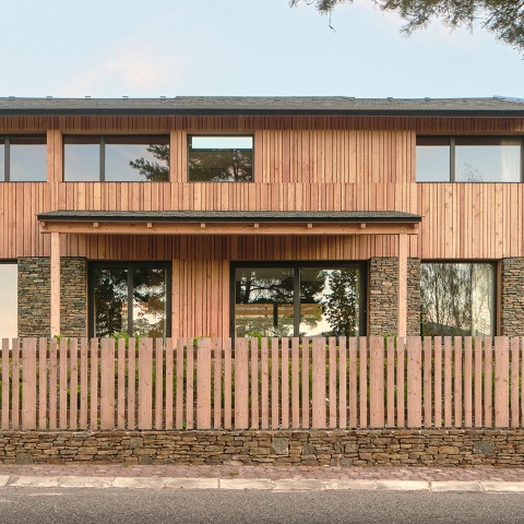 Aprovechando al máximo la edificabilidad permitida, la construcción se realiza a partir de un sistema de entramado ligero de madera forrado con una fachada de piedra de Llívia, cerrando las visuales a los vecinos y abriendo la casa hacia el jardín y las montañas.